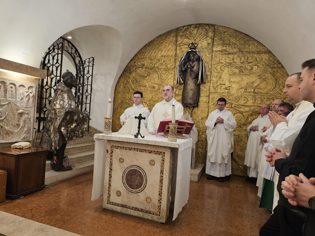 A tanulmányi út második napját, február 10-ét a Szent Péter-bazilika altemplomában található Magyarok Nagyasszonya-kápolnában közös szentmisével kezdték. A szentmise főcelebránsa és szónoka Kovács Gergely gyulafehérvári érsek volt. Vele koncelebrált András István rektor, valamint a Rómában zarándokló magyar papok: Borka Ernő gyergyóalfalvi plébános, Hanuleac Tamás segédlelkész, Fánea József szatmári egyházmegyés pap, püspöki titkár, aki egyben a gyergyóalfalvi zarándokok idegenvezetője is, továbbá Serfőző Levente, a szeged-csanádi egyházmegye papja, aki egy kisebb zarándokcsoporttal tartózkodik Rómában.