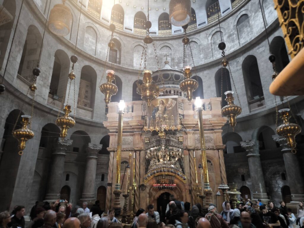 Biztos vagyok abban, hogy jótékony terelgetéssel és ráérzéssel (pláne, ha még ideje is van, mint a tenger) az ember sok mindent megérthet a szenvedéstörténet stációi között haladva, akkor talán nem vonják el a figyelmét a külsőségek annyira… Hanem most ugorjunk egy nagyot, egészen a Szent Sír-bazilikához! A kereszténység legszentebb helye, amely a hagyomány szerint Jézus keresztre feszítésének, sírjának és feltámadásának helyén áll. A 4. század óta zarándokhely – azóta, hogy Szent Ilona megtalálta Jézus keresztjét, és kezdeményezésére már 332-re elkészült az első templom –, napjainkban pedig hat felekezet osztozik rajta: a görögkeletiek, a katolikusok, az örmények, a koptok, az etiópok és a szírek. Valóságos labirintus, amelyben jól megférnek egymás mellett a különböző kultúrák és a különböző elképzelések. A ferenceseknél például Jézus keresztre feszítésén elmélkedünk, továbbhaladva pedig egyszercsak két nyitott és két zárt fakknál találjuk magunkat, ezek jelzik tulajdonképpen az állítólagos temetkezési helyet; de megyünk tovább, irány Szent Ilona kápolnája, és a sok információ és látnivaló közepette még egy érdekesség: amióta Putyin hatalmon van, az oroszok is megszereztek egy kisebb részt a Szent Sír-bazilikából, ők Jézus börtönét „teszik” ide.