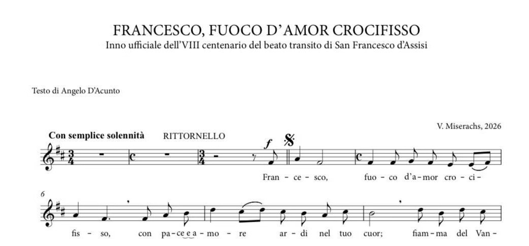 Assisiben csendült fel először a Szent Ferenc boldog halálára emlékező jubileumi év himnusza február 7-én. A mű szerzője nemzetközileg elismert egyházzenei komponista, Valentino Miserachs Grau, aki zenéjében ezúttal is a ferences lelkiség egyszerűségét, derűjét és mélységét idézte meg.