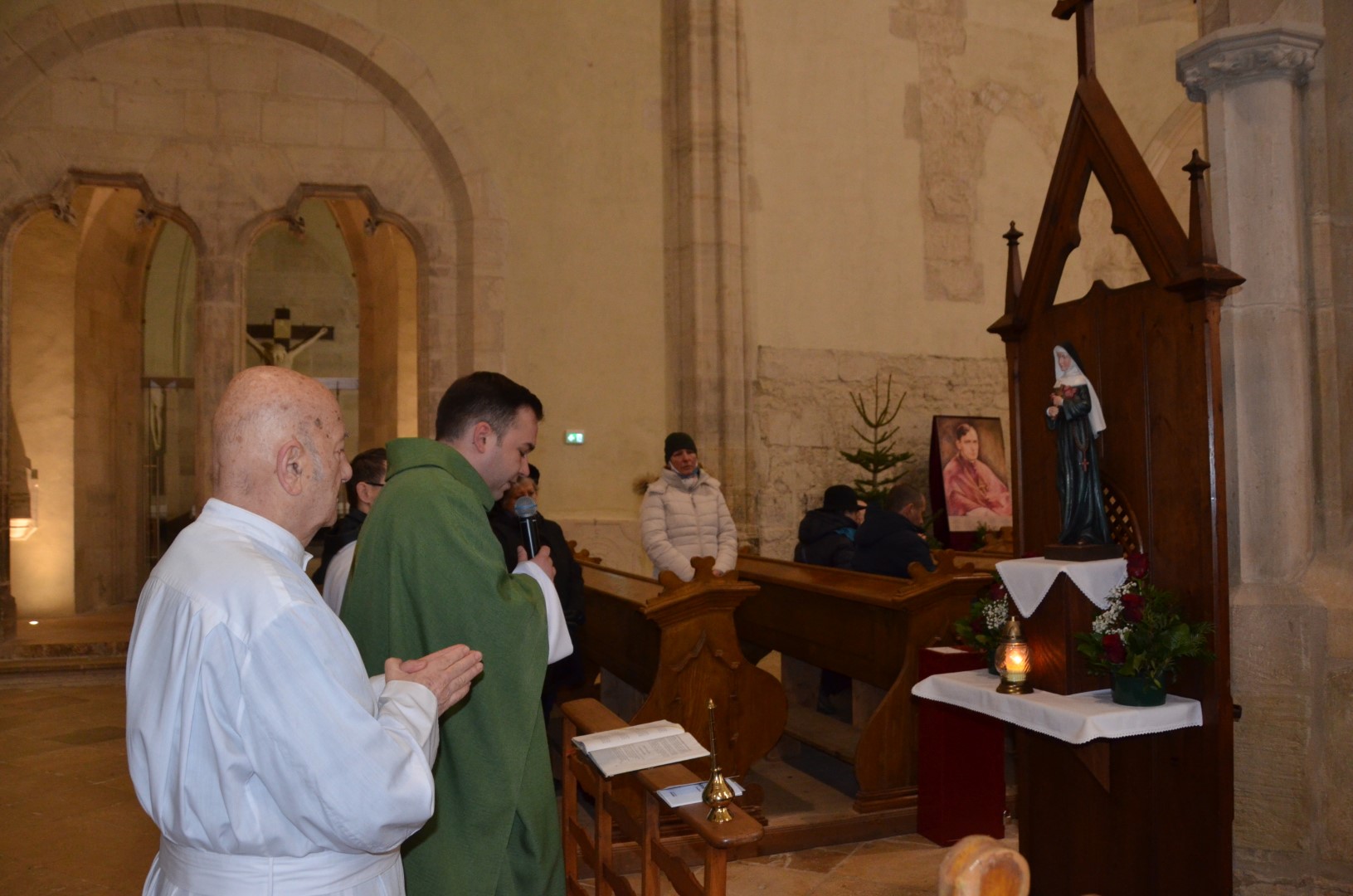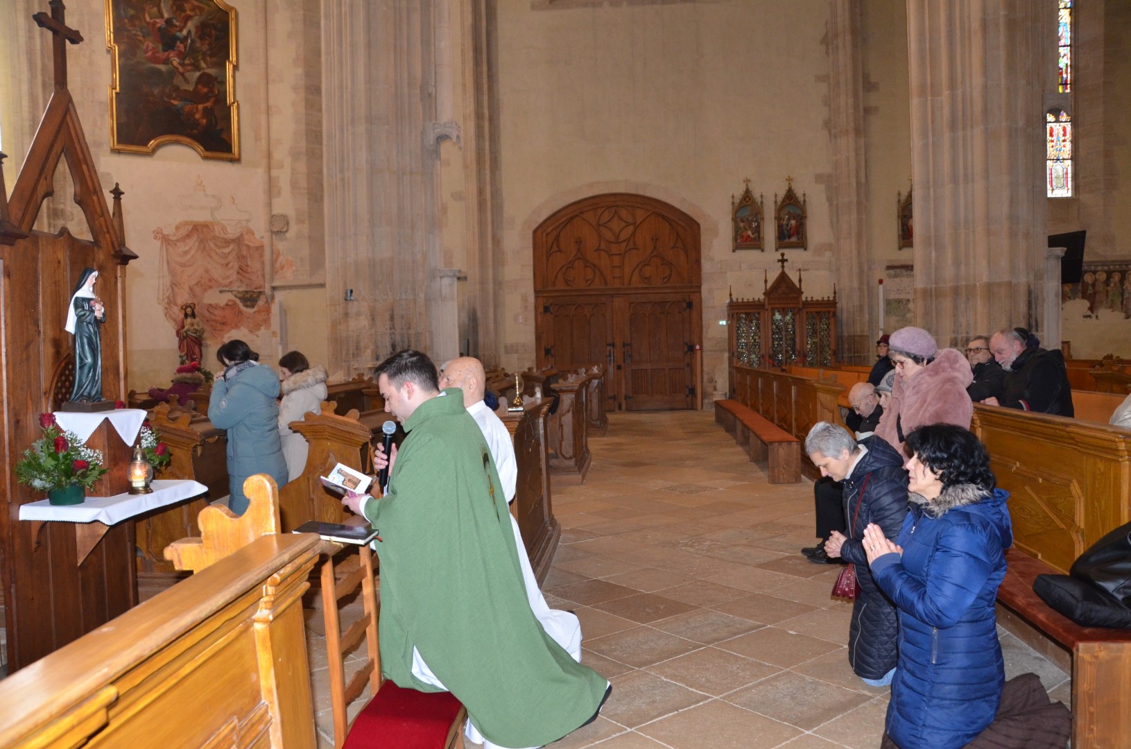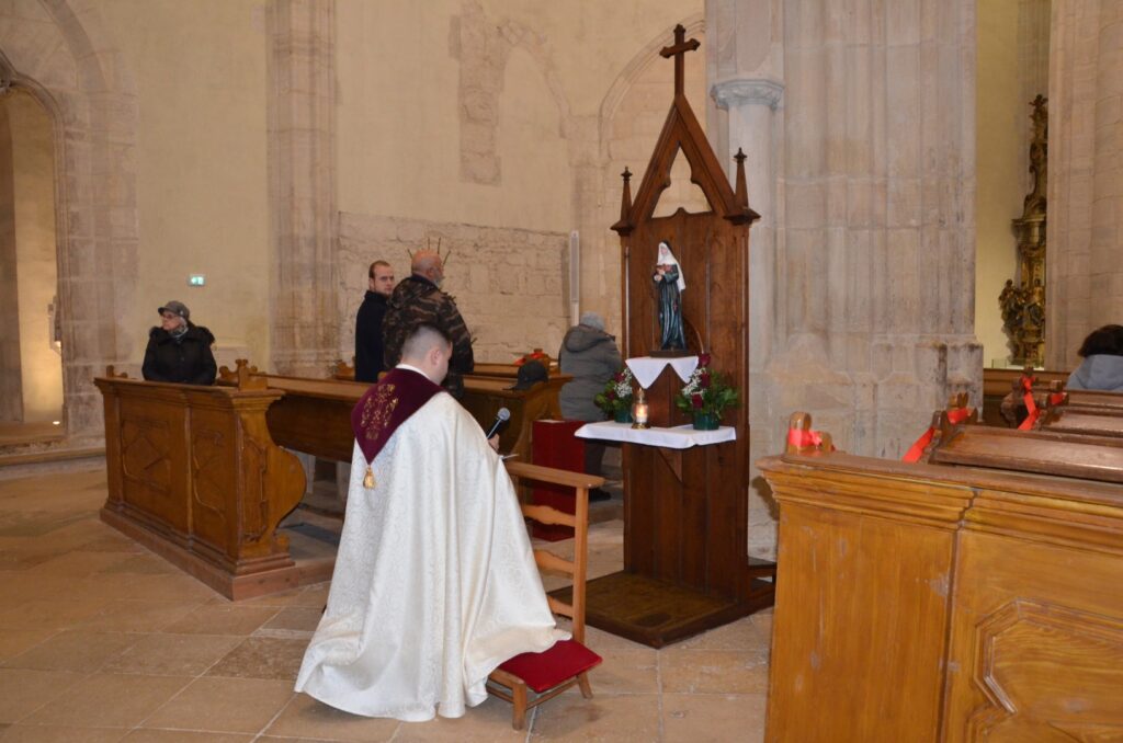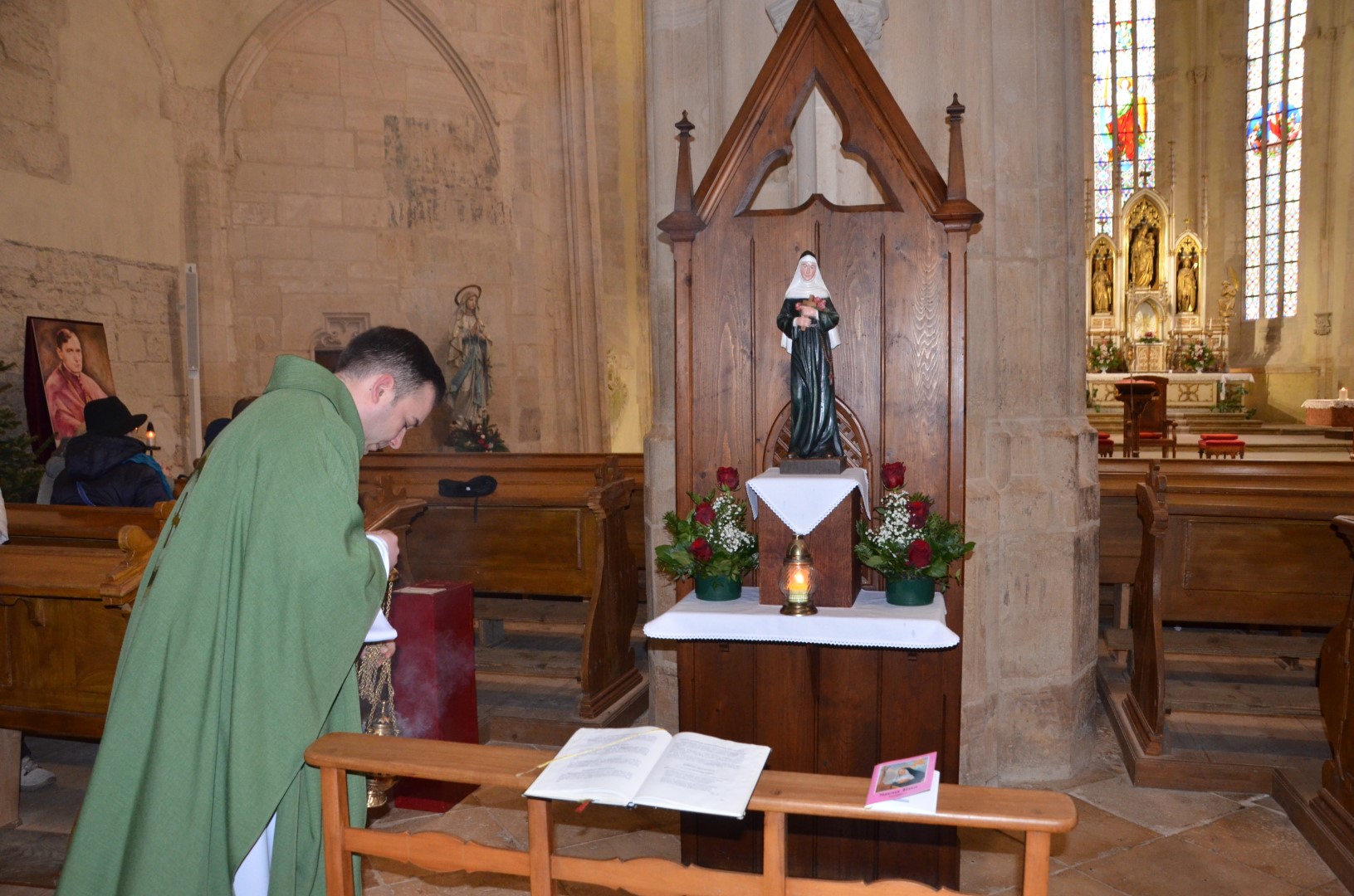 Február 12-én reggel a szentmisére jövő híveket a friss rózsával díszített, égő mécsessel megtisztelt Szent Rita szobor fogadta a főhajóban, a szószék közelében, a padsorok megszakítása között, az első pillérköteg (tartóoszlop) mögött. A legszentebb áldozat bevezetőjében Czirják Ottó, a Szent Mihály-plébánia segédlelkésze Szent Rita életútját ismertette röviden. A legszentebb áldozatban az ószövetségi olvasmány által Isten az ő törvényeinek betartására tanított, melyekben jó, ha a végsőkig kitartunk. Az evangéliumban Szent Márk arra hívta fel a figyelmet, hogy Jézus tanítása nemcsak a keresztényeknek, hanem a pogányoknak, azaz mindenkinek szól. A hittel hozzá folyamodók segélykiáltását nem veti meg. A szentmise befejezése után a szentélyből a miséző a segédkező Fodor György piarista konfráterrel és Balla Dénes ministránssal a Szent Rita-szoborhoz vonult. Példájukat követték néhányan a jelenlevők közül, mások a helyükről követték az eseményeket. Potyó István karnagy Szent Ritához fohászkodó énekkel és orgonajátékával kísérte a szoborhoz közeledőket, kik maguk is bekapcsolódtak az énekbe. Czirják Ottó segédlelkész Isten áldását kérve a szoborra, szenteltvízzel hintette azt meg. Isten kegyelméért esdekelt azok számára, akik e szobor előtt imádkoznak, hogy a szent érdemeiért, ha kérésük üdvösségükre szolgál, a mennyben Krisztusnál meghallgatásra találjanak.