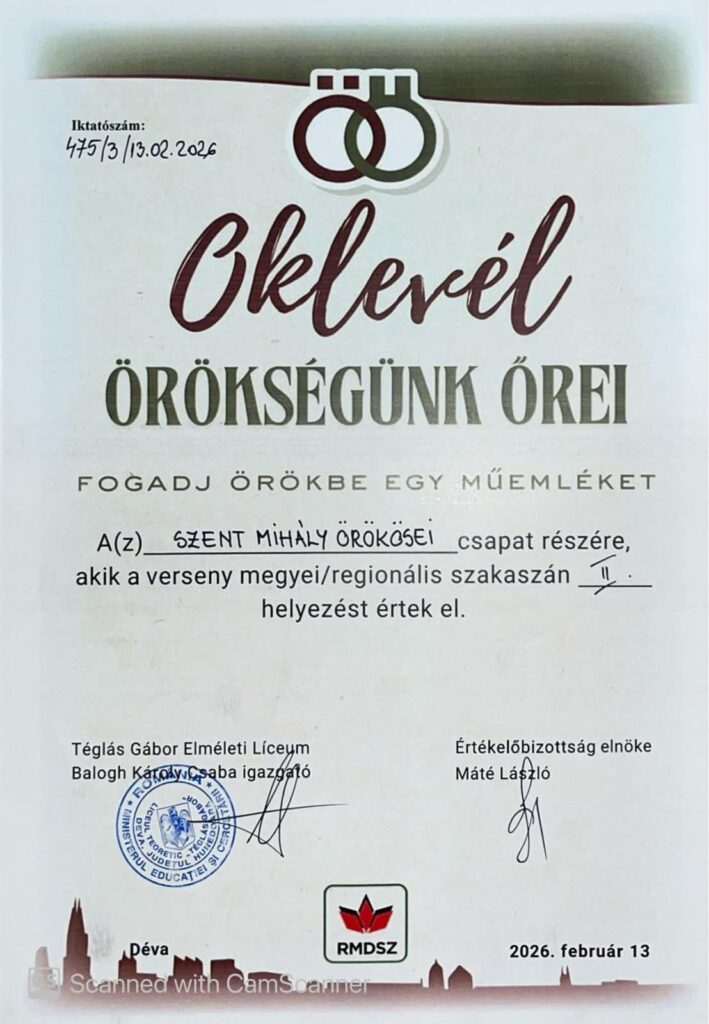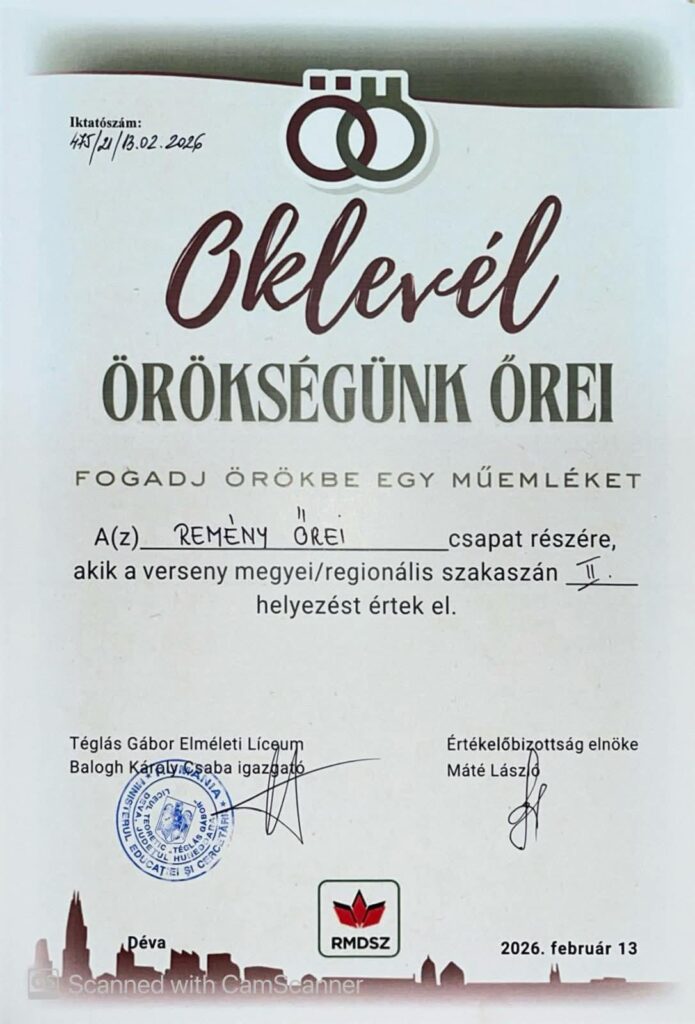 Pénteken, február 13-án tartották az Örökségünk őrei versenyt, amelyen a GMGK líceumi tagozatának csapata, a Remény Őrei is részt vettek. Ők az alvinci templomot vették örökbe, és bemutatójukkal szintén kiváló eredményt értek el, ezáltal továbbjutottak az országos megmérettetésre, amelynek helyszíne Szatmárnémeti lesz.