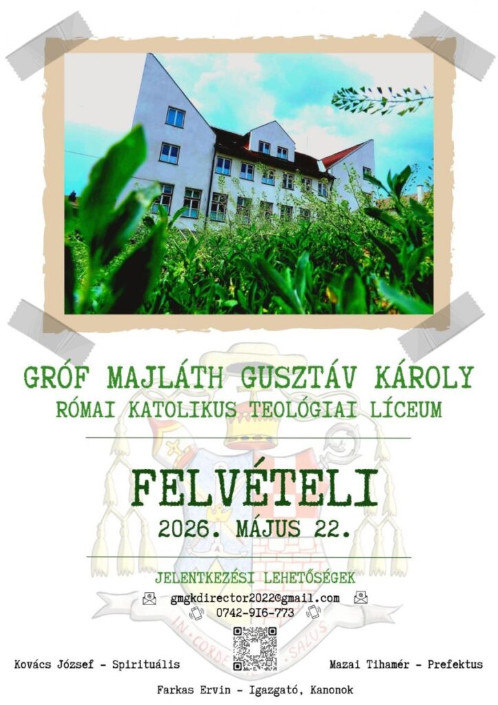 A gyulafehérvári Gróf Majláth Gusztáv Károly Római Katolikus Teológiai Líceum (kisszeminárium) felvételi vizsgát hirdet a 2026/2027-es iskolai évben induló IX. osztályának 24 helyére (fiúknak), akik sikerrel elvégezték a VIII. osztályt, magaviseletük egyetlen tanévben sem kisebb 9-nél, és 2026. szeptember 15-ig nem töltik be a 18. életévüket. A felvételi időpontja: 2026. május 22.