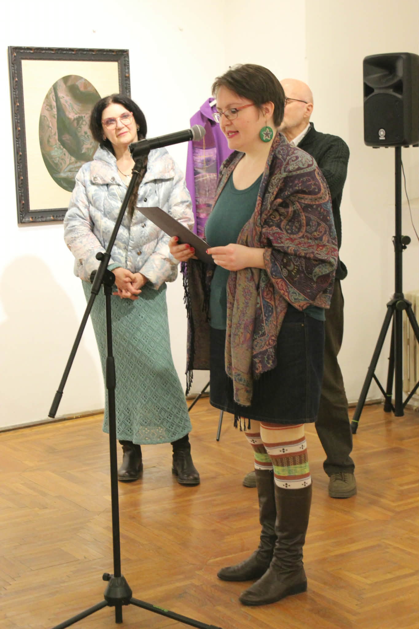 Arra kérte a megnyitón résztvevőket: ,,Adjunk csendet, időt és teret az itt kiállított alkotásoknak. Nem falból, nem azért, mert egy bölcsész némi esztétikai műveltséggel azt kérte. Hanem azért, hogy ebben a viszonylagos csendben meglássuk, ami előttünk van, és meghalljuk a hangját az alkotásnak. És főleg, hogy megérkezzünk mi magunk a csendbe, a csendben a képhez, szoborhoz. Tudják, hogy miért lenne fontos a csend? Mármint a pótcselekvésektől mentes jelenlét? Hogy meghalljuk a visszhangot, az ekhót, ami a szakrálisból áramlik hozzánk ezen a kiállításon keresztül is.” Dénes Gabriella nagy sikert aratott beszédét így zárta: ,,Köszönöm a megtisztelő figyelmüket, ezennel át is adnám a szót, avagy a csendet az alkotásoknak.”