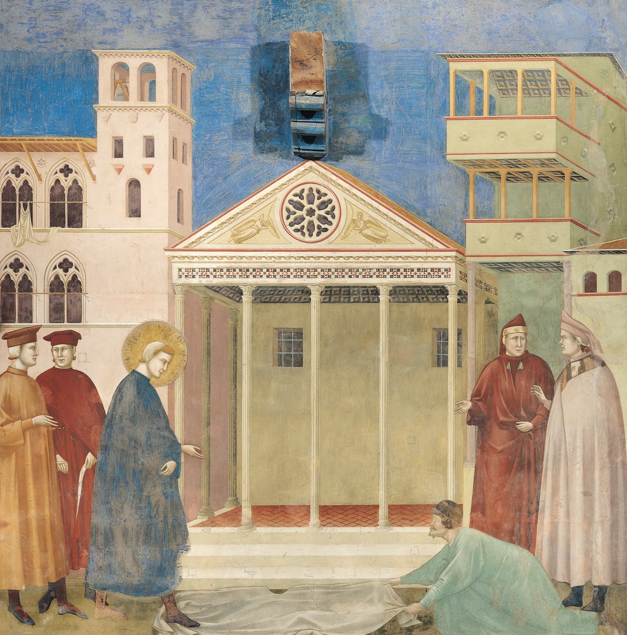Giotto freskósorozatának első jelenete nem a legismertebb Ferenc-epizódok közé tartozik, mégis kulcsfontosságú. A legenda szerint egy egyszerű assisi férfi leteríti köpenyét Ferenc lábai elé, ugyanúgy, ahogyan Krisztust fogadták Jeruzsálemben a húsvét előtti bevonulásakor. Giotto itt nem csodát, hanem felismerést ábrázol: a jelenet lényege az, hogy egy alacsony társadalmi státuszú szereplő intuitívan felismeri Ferenc jövőbeli szentségét, miközben a körülötte állók közömbösek vagy értetlenek.