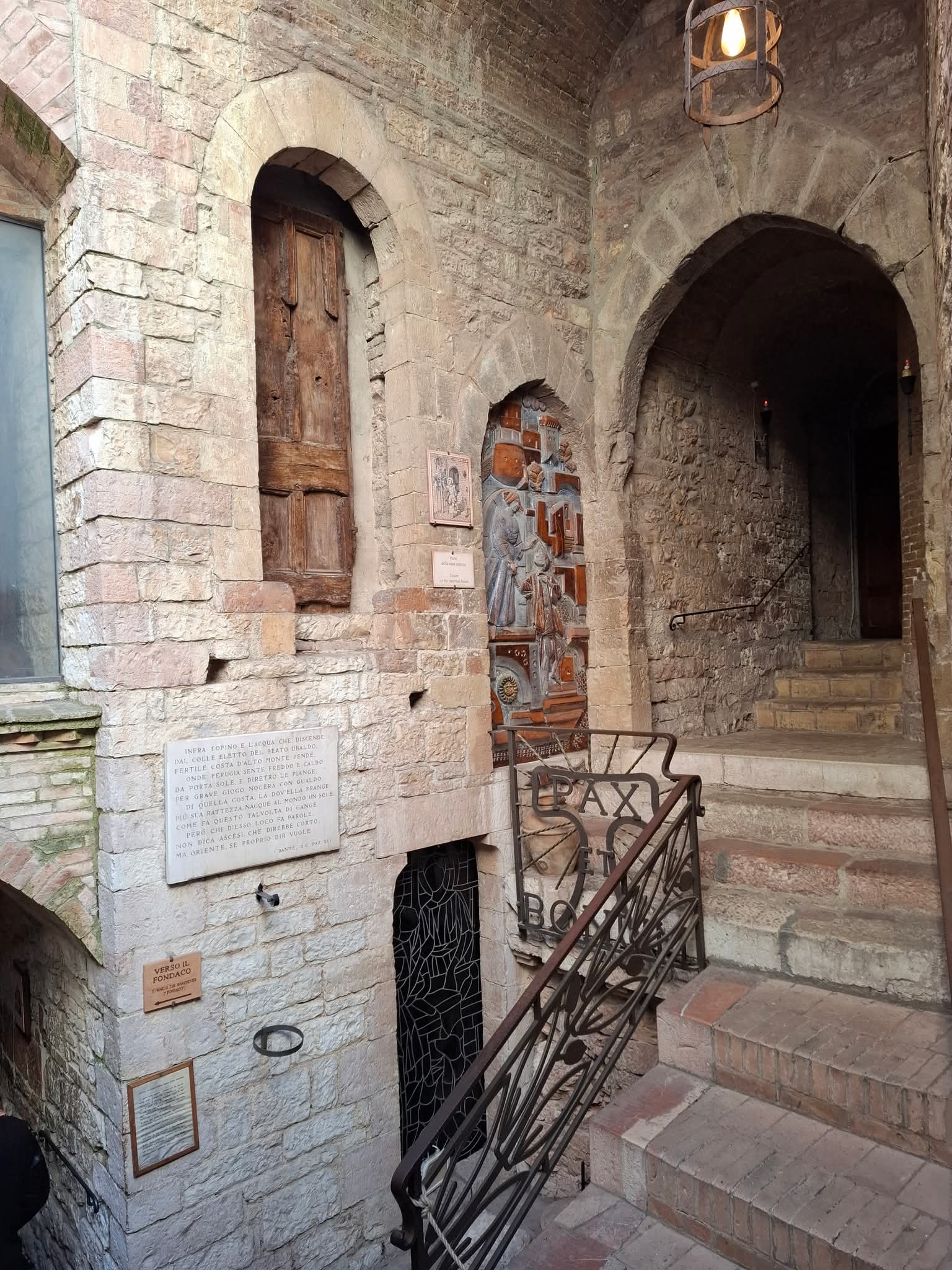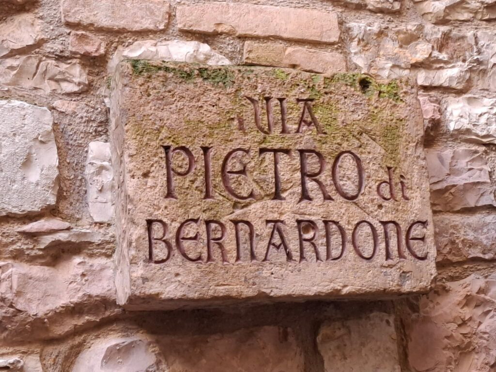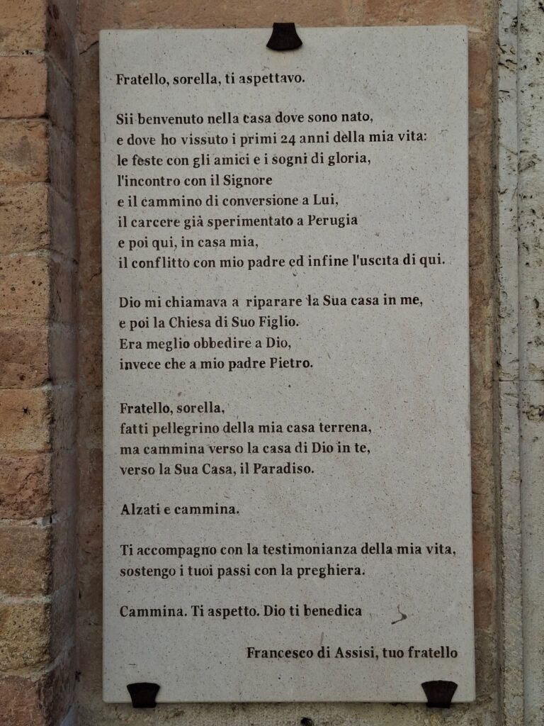 A San Francesco-bazilikában „az Úr keze másként érintett” (Zsolt 77,11), érzem, akarja a folytatást, ezért maradok Ferenc nyomdokán és indulok a forráshoz, ahol napvilágot látott. A főtéren jobbra a spoletói völgy felé indul a Via di Pietro Bernardone, az apjáról nevezett utca. Kisebb térre jutok le és látom, az ősi Bernardone-ház helyén ma templom áll, mégpedig a Chiesa Nuova, az új templom, melynek kapuja mellett a falon maga Ferenc üzeni az érkező zarándokoknak: