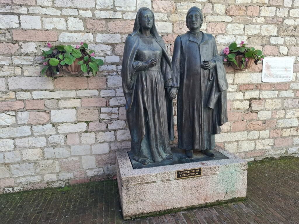 Ebédidőben érkeztem, a templom zárva, de maradok és leülök egy rózsafüzérre. A szülői ház templomtól jobbra kettős szobor áll, alul felirattal: „Szent Ferenc szüleinek”. Egymás kezét fogják, Pica asszony jobbjából – utolsó látogatásom óta – levették a bilincset, melyet egykor ő oldott le fia kezeiről, amit korábban a dühös és szigorú apa vert a vagyonát eltékozló gyermekére.