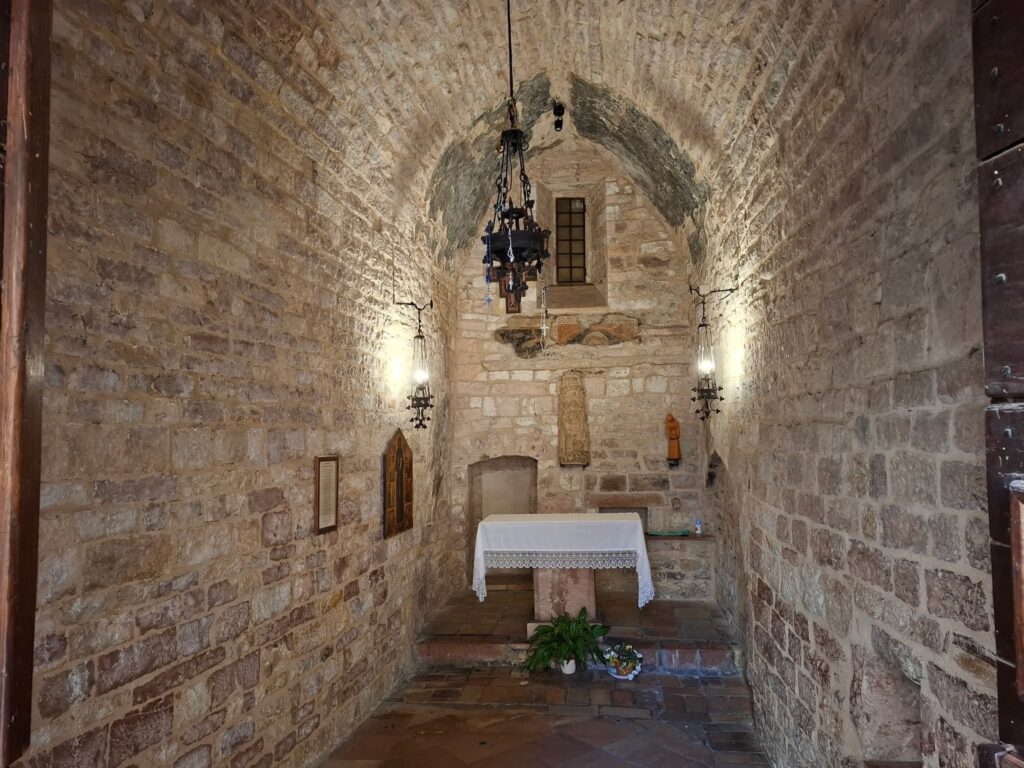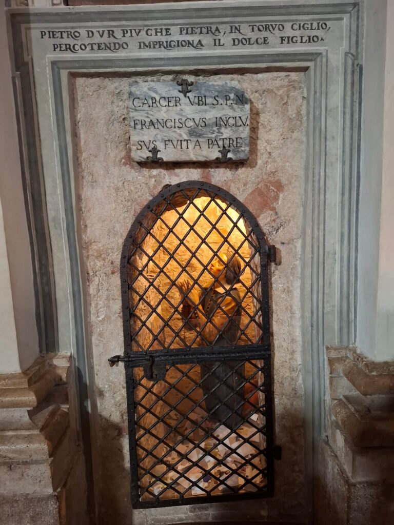 Amikor Isten keze megérintette Ferencet, őszintén és hevesen kereste a megfelelő választ, aztán lassanként és fokozatosan mind mélyebben megértette, mire is hívja őt az Ura. Most, 800 évvel Tranzitusa után az egész egyház világosan látja, hogy milyen „páratlan kalandra” kérte fel őt az Isten. Mindezért neki is sokat kellett szenvednie, kezdettől fogva, még a szülői házban is. Erről is beszámol a Három Társ és amint a templom megnyílott, meg is álltam benne a szűk kis cella előtt, ahol egykor Ferenc szószerint „háziőrizetben” raboskodott.
