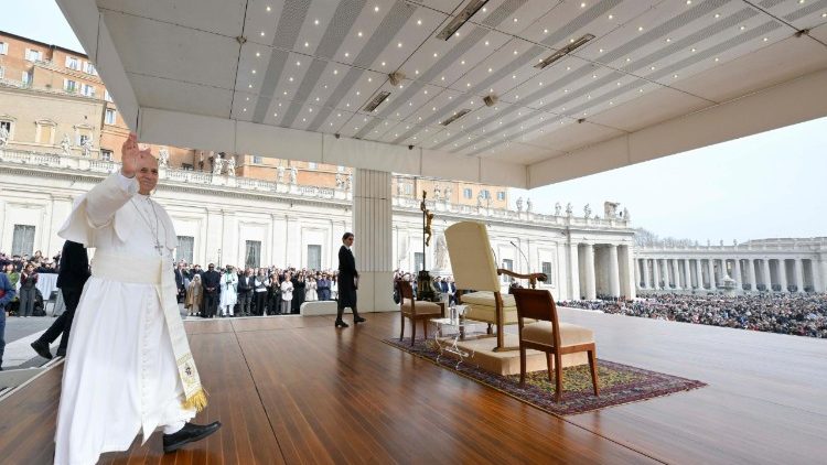 Nem létezik ideális és tiszta, a földtől elszakított egyház, csak Krisztus egyetlen egyháza, mely megtestesült a történelemben. A Lumen gentium k. dogmatikus konstitúció elemzését folytatva a szerdai általános audiencián a pápa az egyház kettős dimenziójáról, emberi és isteni természetéről fejtette ki gondolatait. Az első alkalommal, a nagyböjti lelkigyakorlat előtt, hamvazószerdán az egyház fogalmáról volt szó.