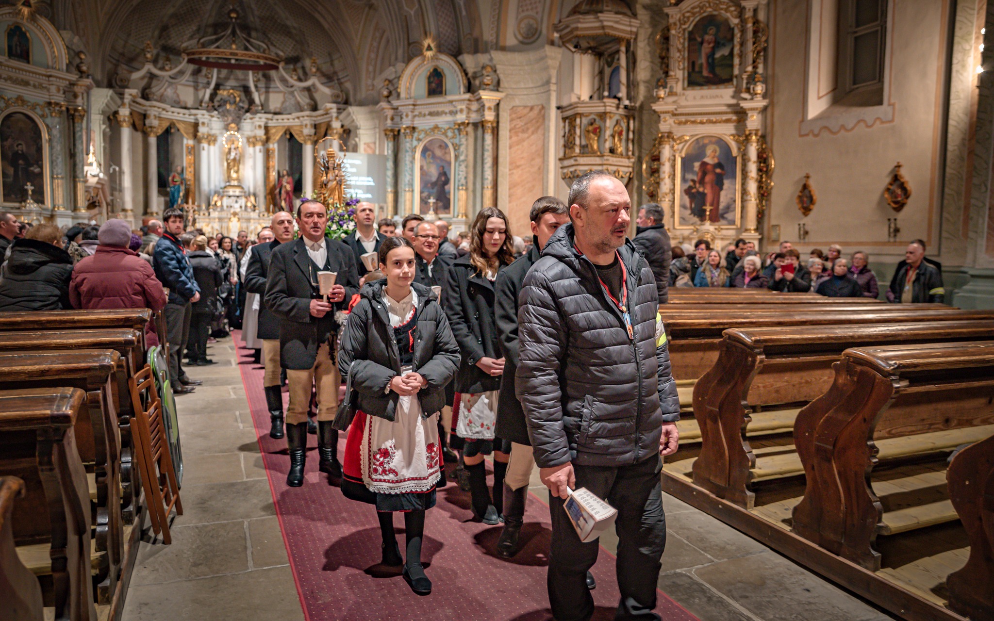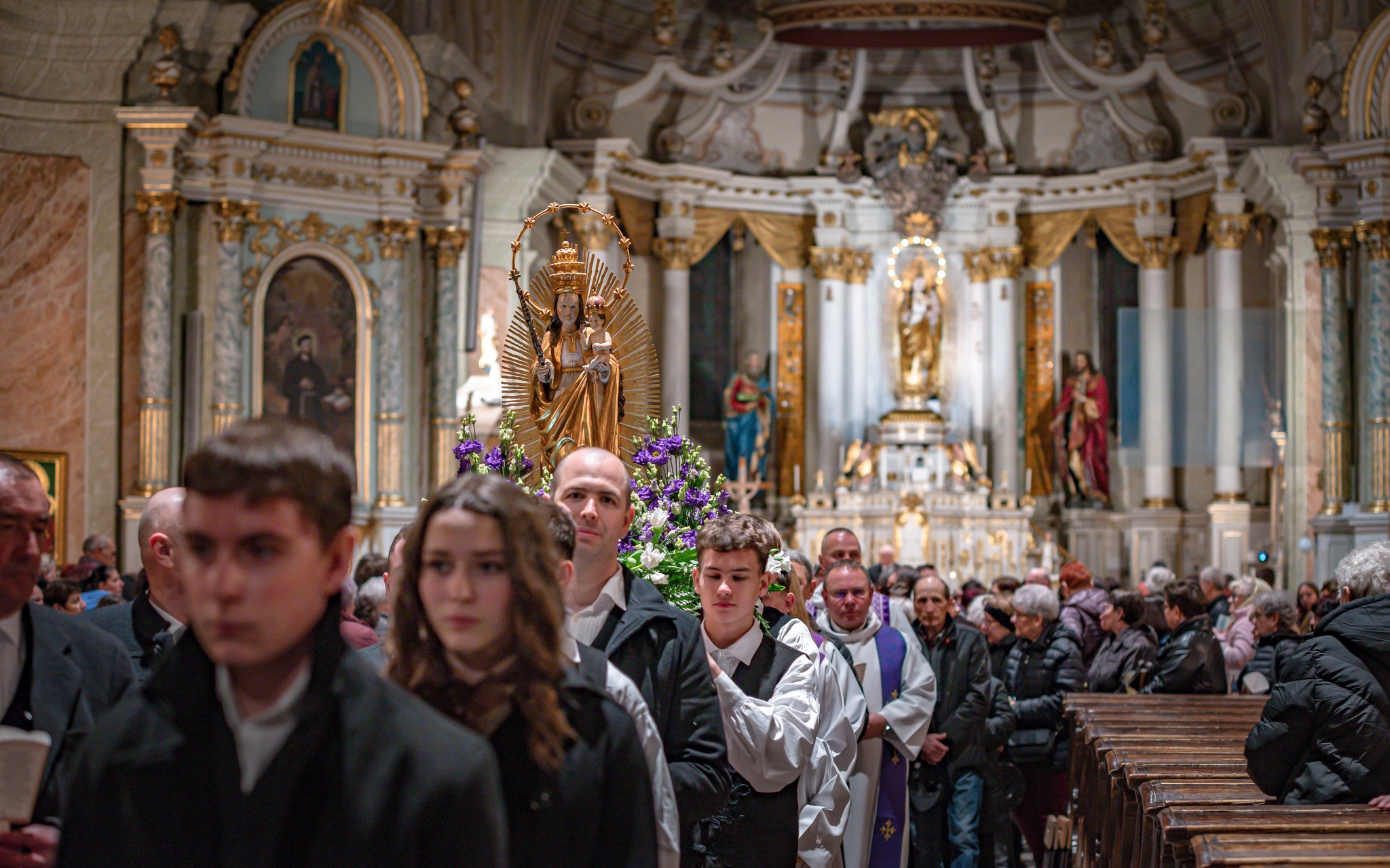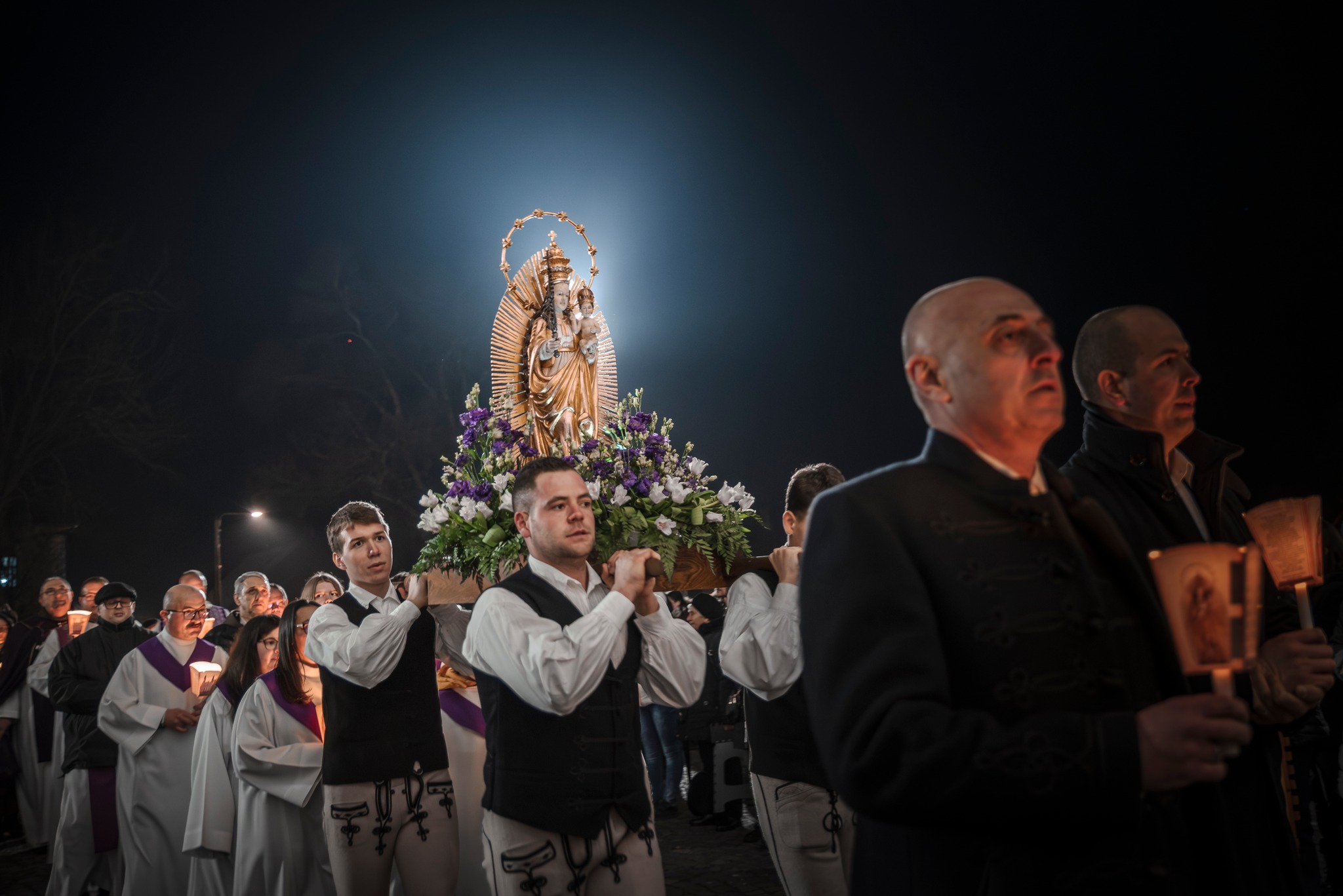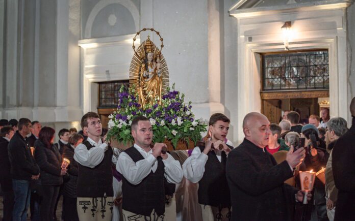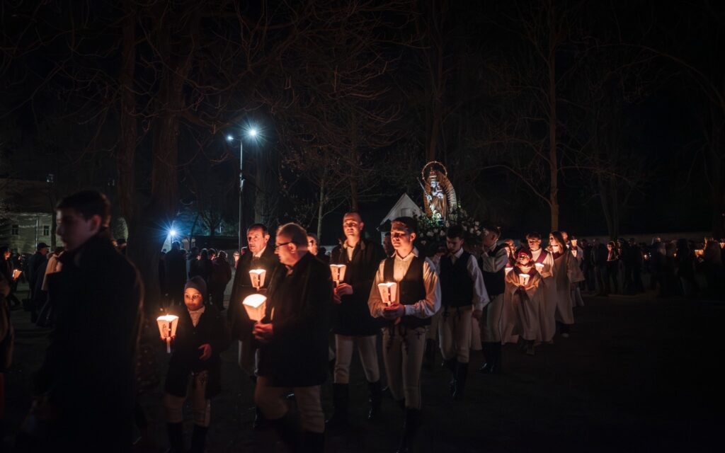 A szentmise után ugyancsak a kadicsfalvi-bethlenfalvi hívek vezetésével a fájdalmas olvasót imádkozták a zarándokok. A gyertyás körmenetben népviseletbe öltözött fiatalok vitték a Szűzanya kegyszobrának másolatát.