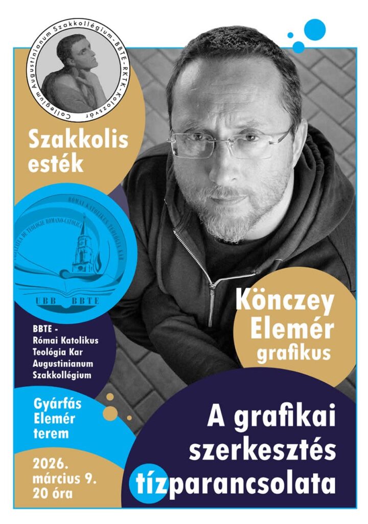 Könczey Elemér grafikus volt a Collegium Augustinianum Szakkollégium meghívottja március 9-én este 8 órától a Babeș-Bolyai Tudományegyetem Római Katolikus Teológia Karának Gyárfás Elemér-termében. A grafikai szerkesztés tízparancsolata címen a vizuális kommunikáció alapjait mutatta be és műhelytitkokba is beavatta a hallgatóságot.