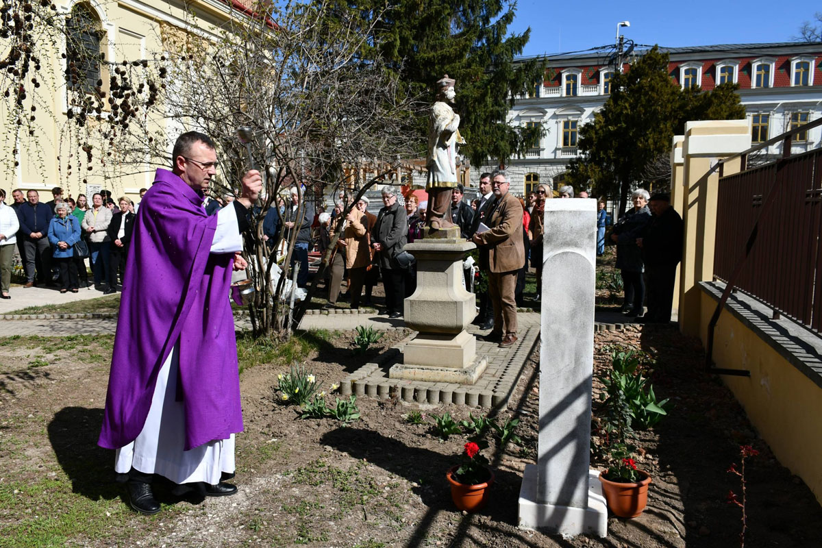 A szentmisét követően a jelenlévők a templomkertbe vonultak, ahol részt vettek a sírkő megáldásának szertartásán. „Jézus arra buzdít, hogy fogadjuk be a gyermekeket, a szegényeket. Mi most egy sírkövet fogadtunk be templomunk kertjébe. De ez nem csak egy kő, hiszen emberi sorsokat takar. Ezért itt a Józsefvárosban ez a sírkő is emlékhely lehet. Akárcsak a plébánia udvarán, a Mária-szobor fölött elhelyezett ágyúgolyó, amit 1849-ben éppen ide, a templomunk falába lőttek be, és amit tudatosan helyeztünk a Szűzanya oltalma alá. Azt mondják, hogy ott, ahol a halottakat nem tisztelik, ott előbb-utóbb az élőket sem fogják tisztelni. Ahogy bánik egy társadalom a temetőivel és az elhunytjaik sírjával, úgy bánik az élőkkel is. Ezért nekünk nem szabad elfelednünk elődeinket, történelmünket, mindazokat, akik előttünk dolgoztak, küzdöttek” – mondta a szertartás kezdetén Szilvágyi Zsolt plébános.