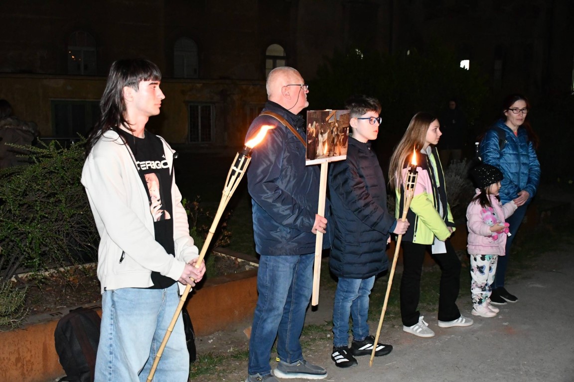 „Urunk, Jézus Krisztus, azért jöttünk, hogy imádságban kövessük a kereszt útját, amelyet Pilátus házától egészen a Golgotáig jártál végig. Elmélkedünk nagy szereteteden és irgalmadon, amellyel engedetlenségünket jóvátetted, és eltörölted a világ bűneit. Irgalmadra bízzuk szeretteinket és minden embert. Rád bízzuk önmagunkat is bűneinkkel és fájdalmainkkal együtt” – mondotta az ájtatosság elején Kocsik Zoltán lelkipásztor. Ezt követően a fiatalok körmenetben indultak a keresztút állomásaihoz, amelyeket fiatalokból álló 3–4 fős csoportok jelképeztek, akik fáklyákat és az adott stáció képét tartották.