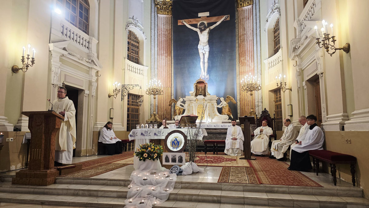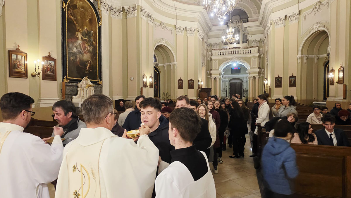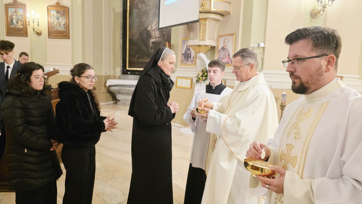 Az evangélium felolvasását követően a közösség megható pillanatnak lehetett tanúja: a három piarista nővér – Ágnes, Bori és Dania nővérek – ünnepélyes keretek között megújították szerzetesi fogadalmukat, megerősítve Krisztushoz és hivatásukhoz való hűségüket.