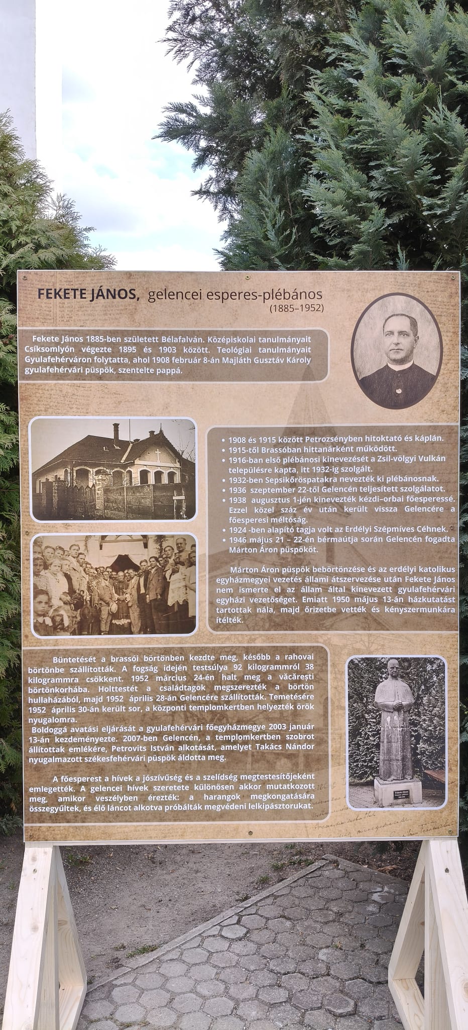 A szentmise áldása után Kovács Attila, Gelence község jegyzője ismertette a templom előtt felállított három emlékpannó tartalmát: Fekete János életútját, papi hivatásának állomáshelyeit, munkásságát, a gelencei ifjúsági szervezetek működését (1932-1948) — ezek fellendüléséhez nagyban hozzájárult Fekete János főesperes-plebános. Az 1939 márciusától újjáalakult legény- és leányegyletek célja volt a katolikus szellemű, erkölcsileg és társadalmilag elkötelezett ifjúság nevelése. A programokban egyházi és népi énekek, vallási oktatás, szavalatok, felolvasások, székely dalok és táncok szerepeltek. Emellett szórakoztató műsorokat, színműveket is betanultak, amelyeket kezdetben Gelencén vasárnap és alkalmi rendezvényeken, később a szomszédos településeken is előadtak. A korabeli fotók csoportképei a helyi ifjúság körében örökítik meg a főesperes személyét, ez is bizonyítja, mennyire szerették az akkori a fiatalok a plébánosukat, aki fontosnak tartotta az ifjúság erkölcsös, a társadalom számára teljes értékű emberré nevelését.