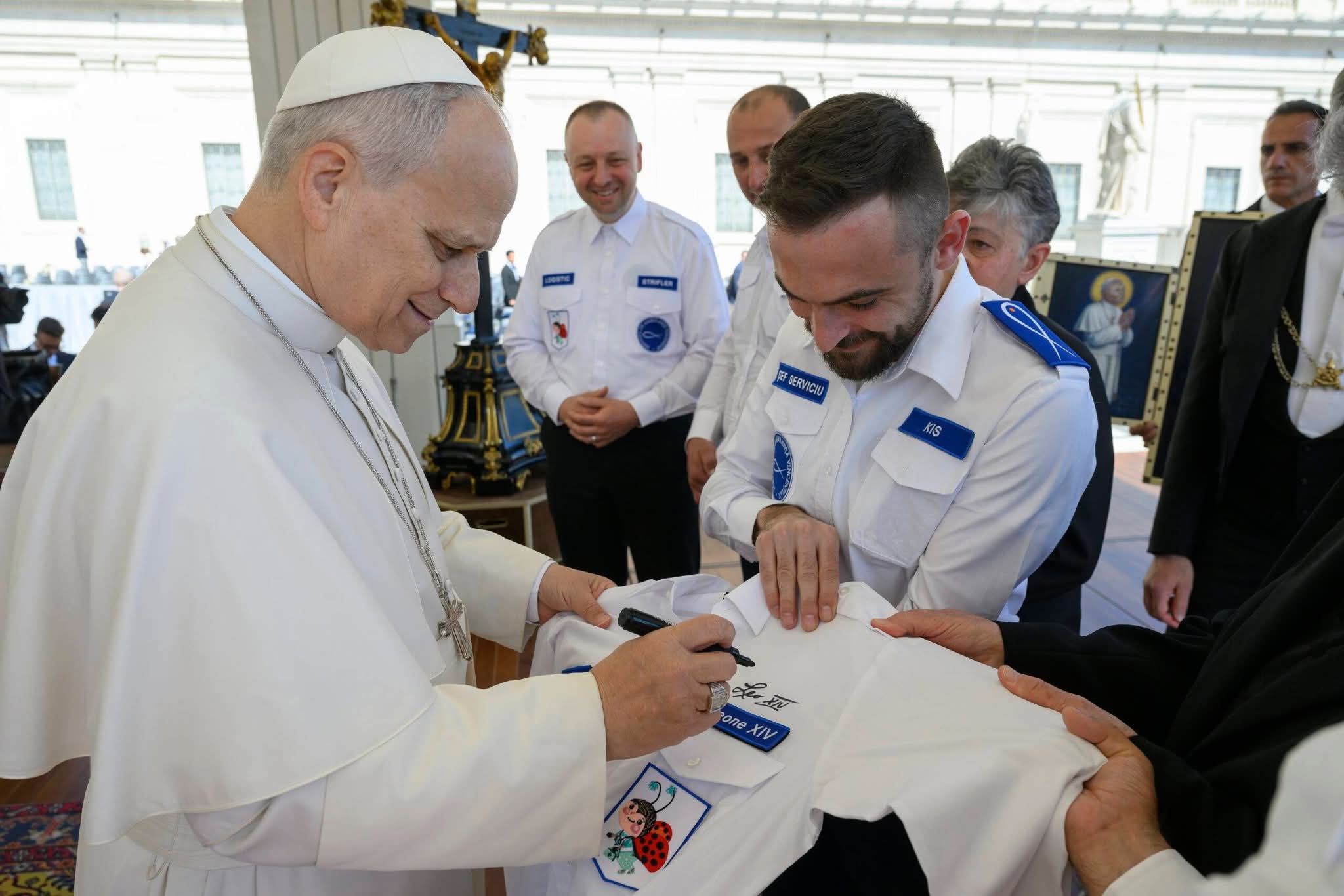 A találkozó során a küldöttség ajándékokat nyújtott át a szentatyának, többek között egy, a szolgálatot jelképező inget adtak át, amelyet XIV. Leó aláírásával látott el.