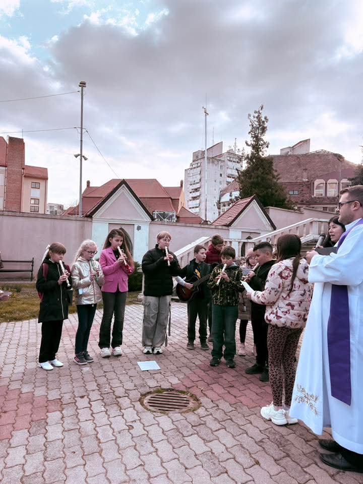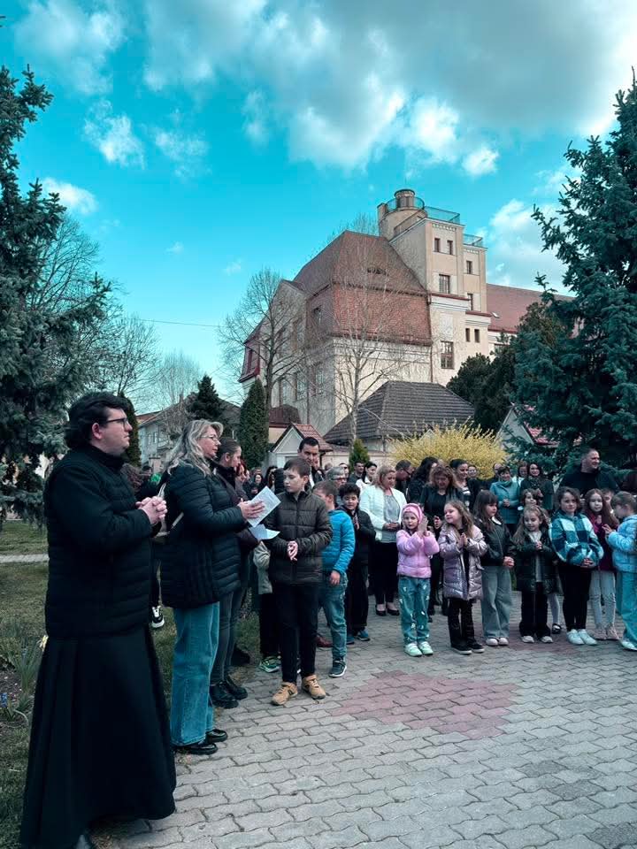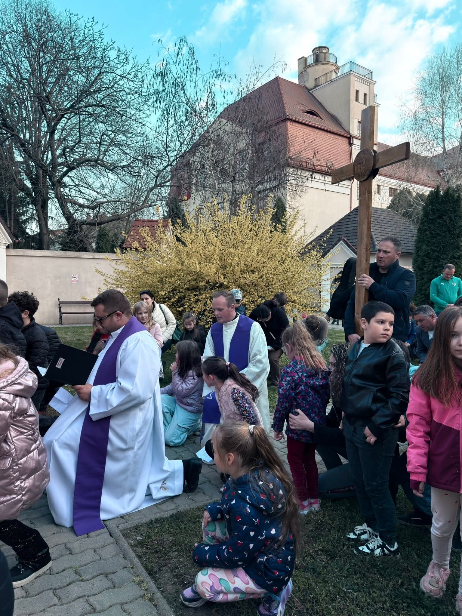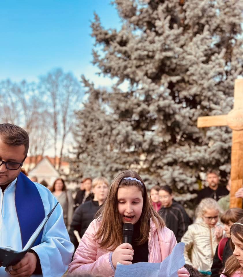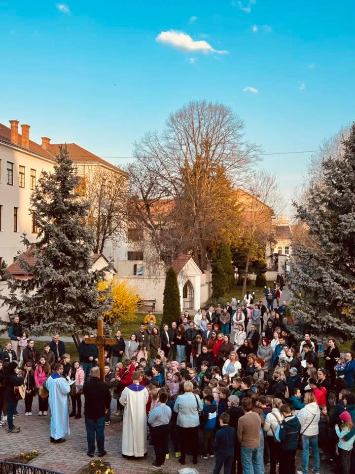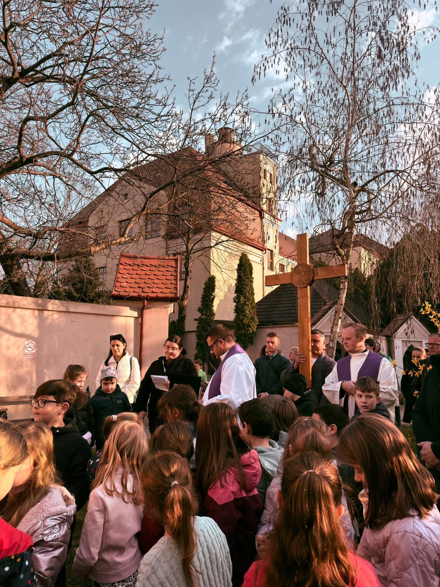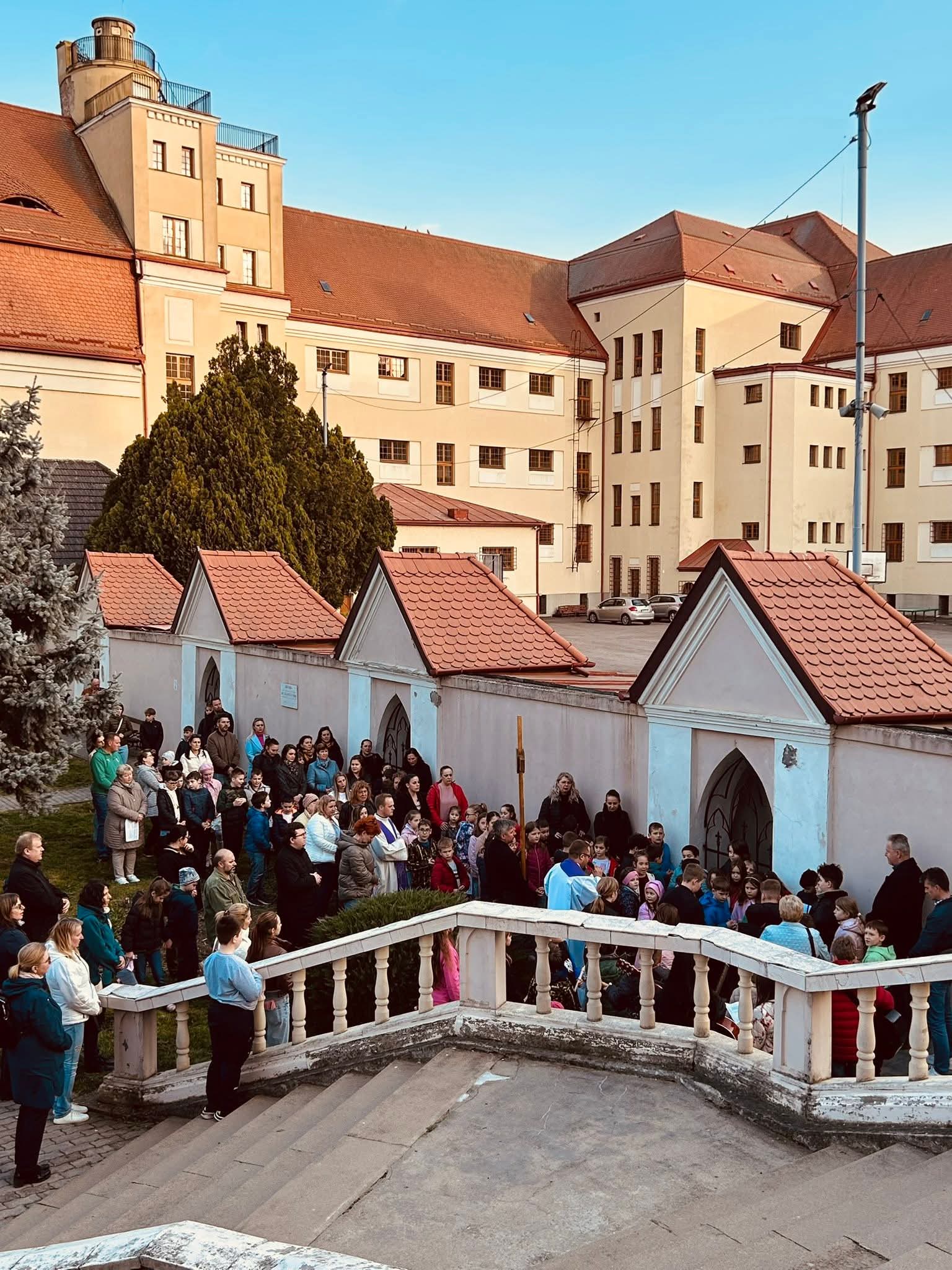 A Hám János-iskolaközpont elemi osztályosainak közös keresztútja a Kálvária templom udvarán.