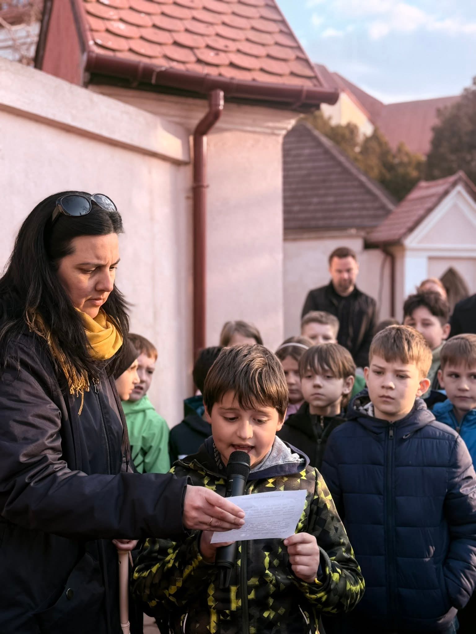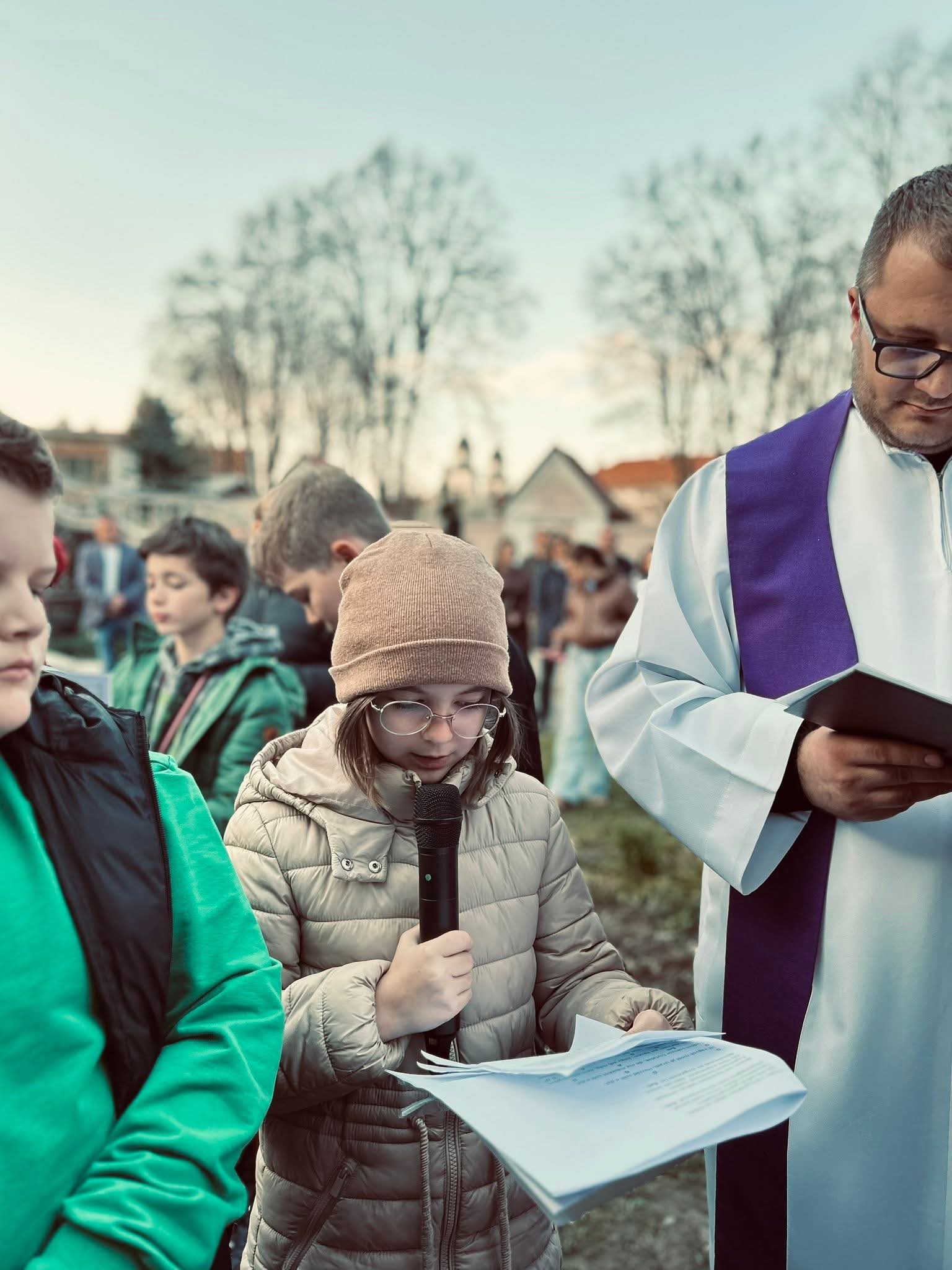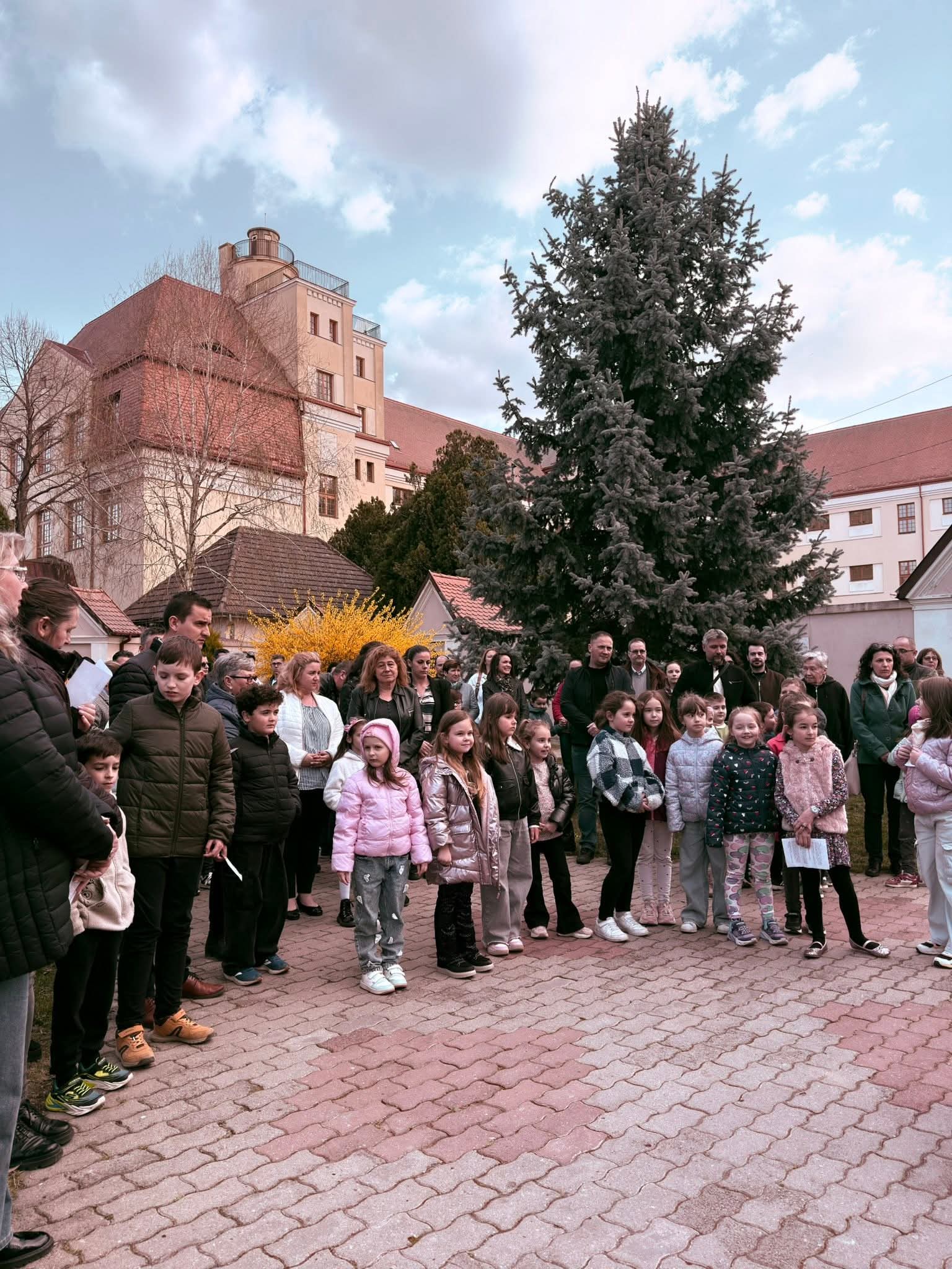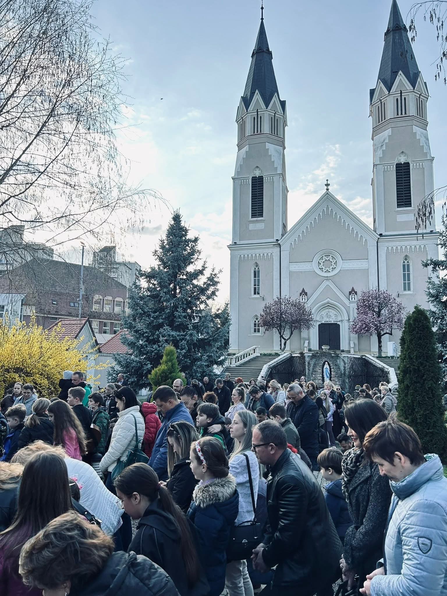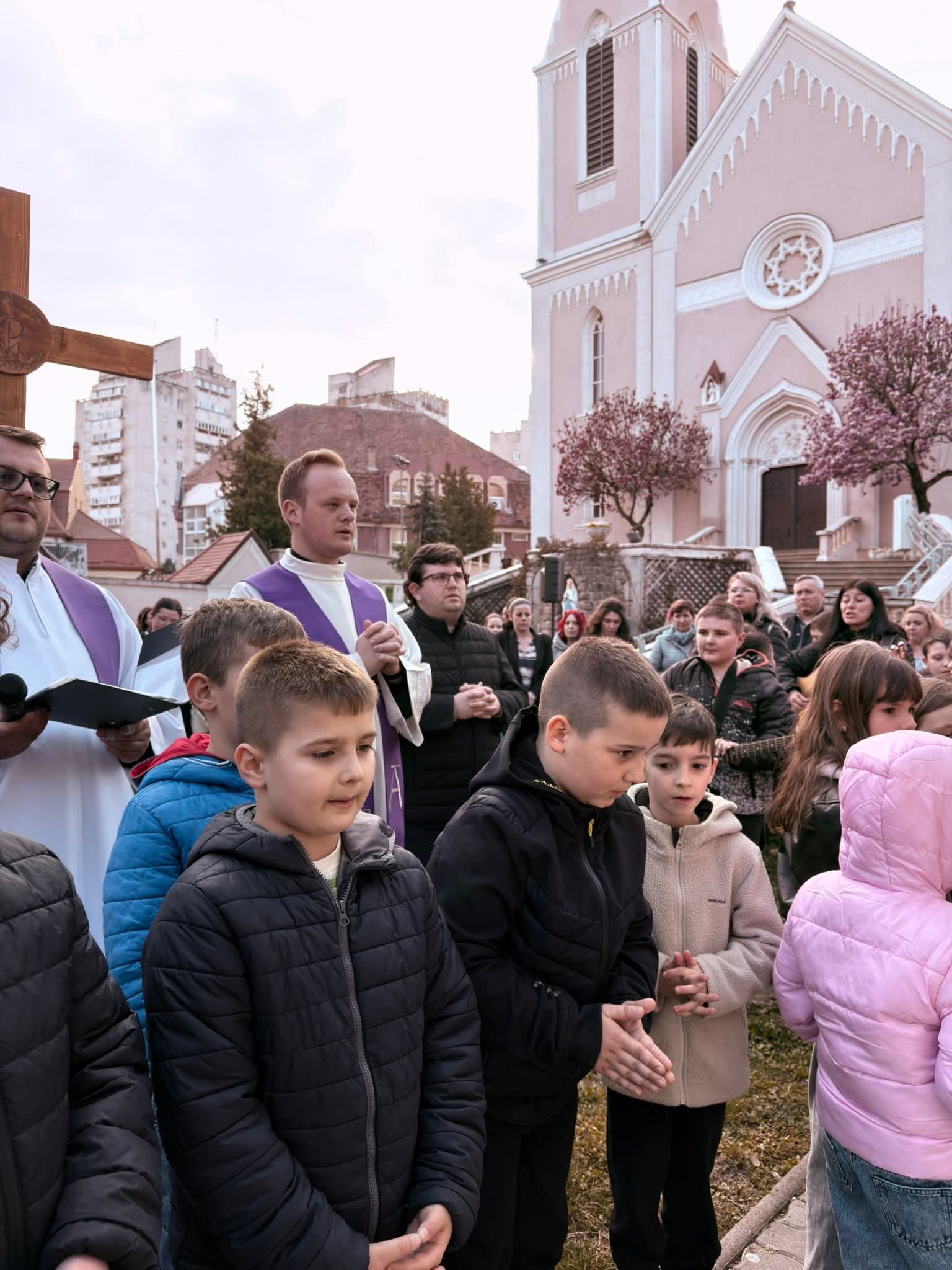 A Hám János-iskolaközpont elemi osztályosainak közös keresztútja a Kálvária templom udvarán.