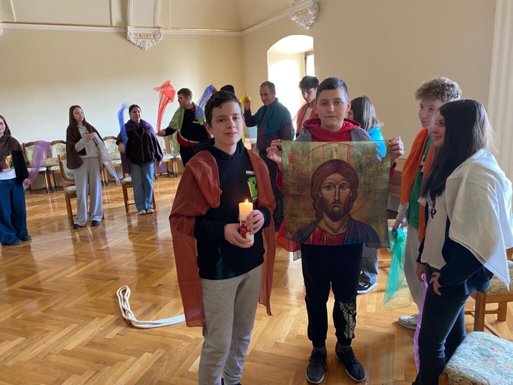 A hét első napjaiban a 3.B, 7.B és 11.B osztály tanulói vettek részt a foglalkozásokon. A legkisebbek kreatív módon jelenítették meg a jeruzsálemi bevonulás kapuját, amelyen keresztül az Úr Jézus belépett a szent városba. Az események felelevenítése során ők maguk is az ünneplő közösség részeseivé váltak: Hozsannát zengtek, és jelképes ruháikat az Üdvözítő elé terítették.