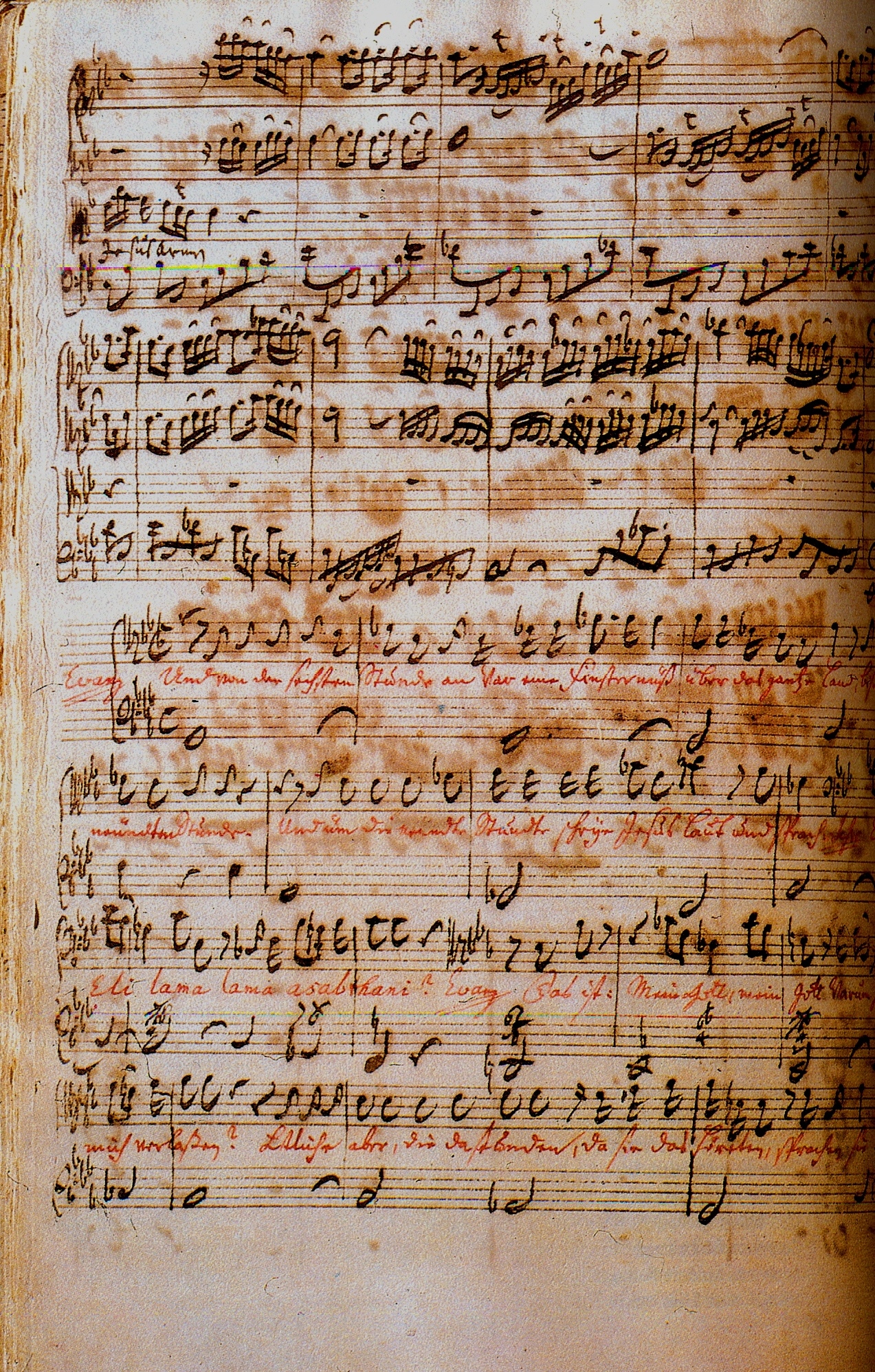 A szöveg és a zene végig szoros, elválaszthatatlan kapcsolatban állnak egymással. Bach végig alkalmazza a barokk korra jellemző szófestés technikáját és a zenei retorika motívumait. Kiemelkedő példa erre a nyitókórusban a passion (szenvedés) szó alatt történő saltus duriusculus motívum, az evangélista recitativóiban fellelhető szófestő motívumok, például a korbácsütések utánzása, a Kreutzige! tételekben domináló keresztmotívumok használata, kromatikája, feszes ritmusa. Az áriákban jelen lévő motívumok, amelyek a szöveg képeit, szavait jelenítik meg, mint például a Zerfließe, mein Herze, in Fluten der Zähren (Ó, szívem, folyjon a könnyek árja) szoprán ária sóhajmotívumai, a fuvolák dallama, amely a könnyek folyását és potyogását is imitálja, vagy a szólista szólamában található sírást, zokogást imitáló motívumok szintén a szövegben levő képeket zenésítik meg.
