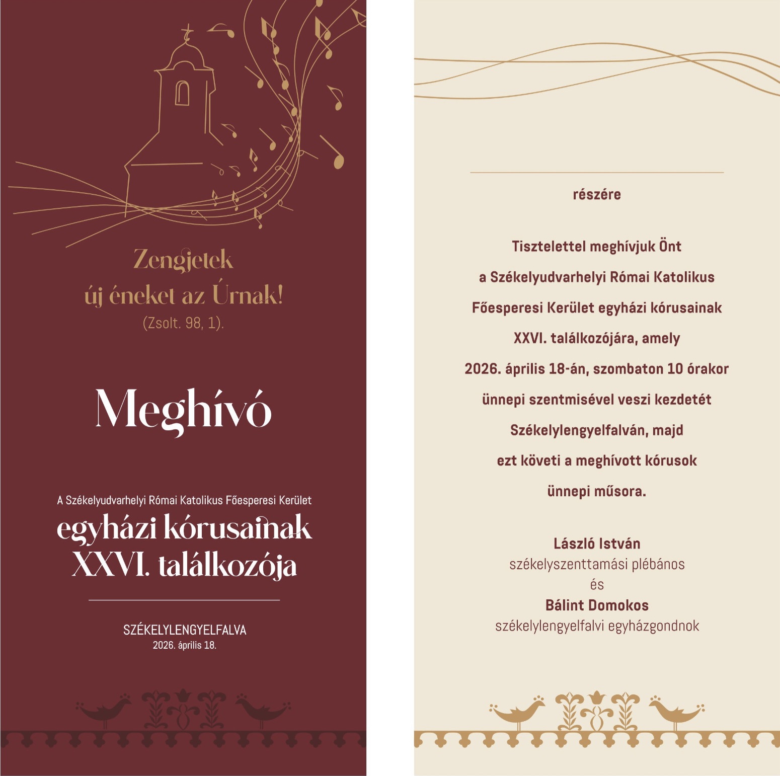 A szervezők és támogatók nevében László István székelylengyelfalvi plébános minden jóakaratú embert hív és vár a szép eseményre, hogy aki e találkozón résztvesz, feledje el egy pillanatra a világban tapasztalható borzalmakat, lépjen be néhány órára az énekek segítségével a mennyei Jeruzsálembe. Így ugyanis már előre átélhető az, amit a megdicsőült lelkek tapasztalnak: Krisztus győz a bűn, az igazságtalanság és halál fölött. Evilági fájdalmaink az ő megdicsőült sebhelyeinek fényével egyesülnek, és eljön egyszer az idő, amikor teljesen fölszabadultan mi is bekapcsolódhatunk az „új ének” dallamába.