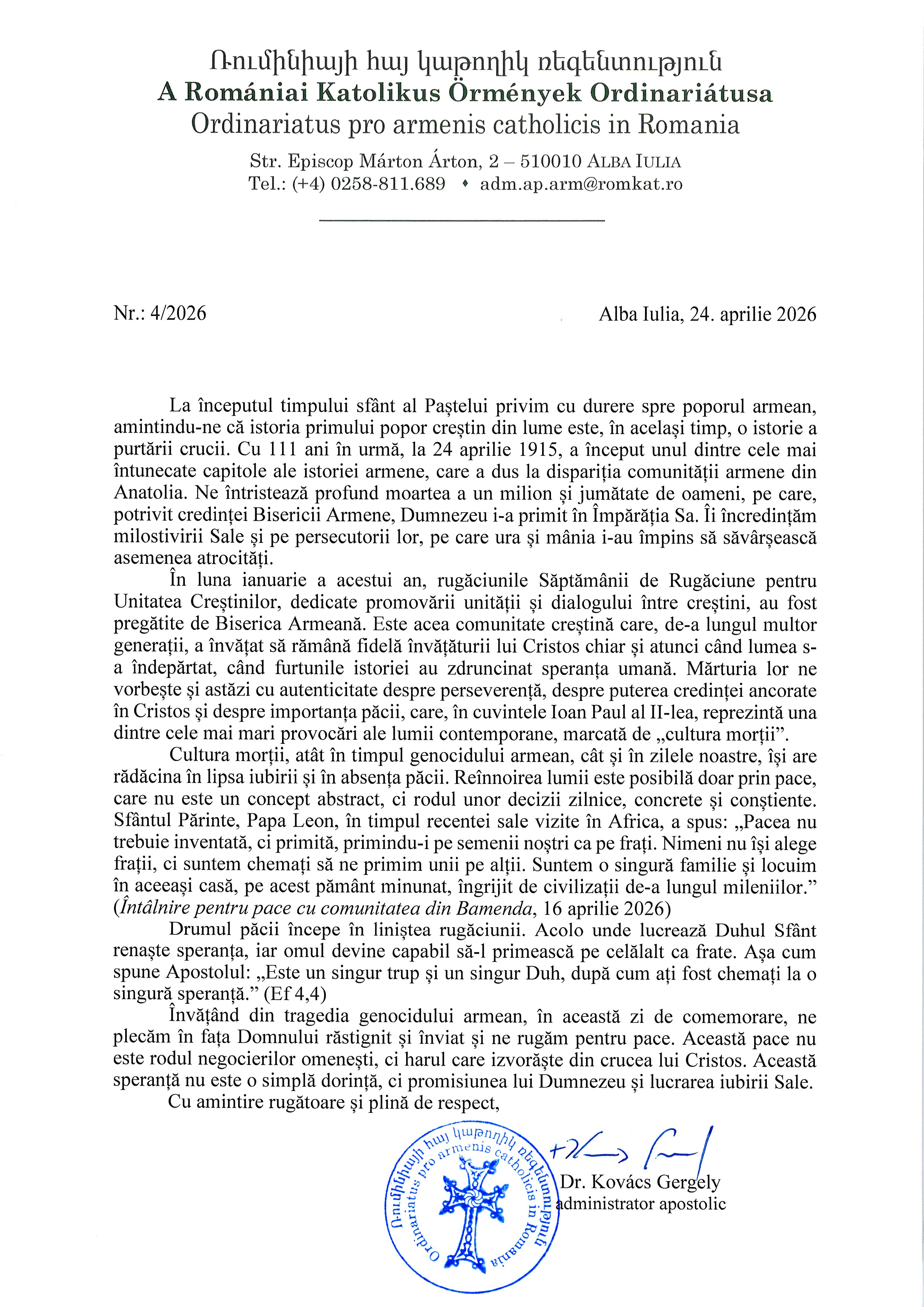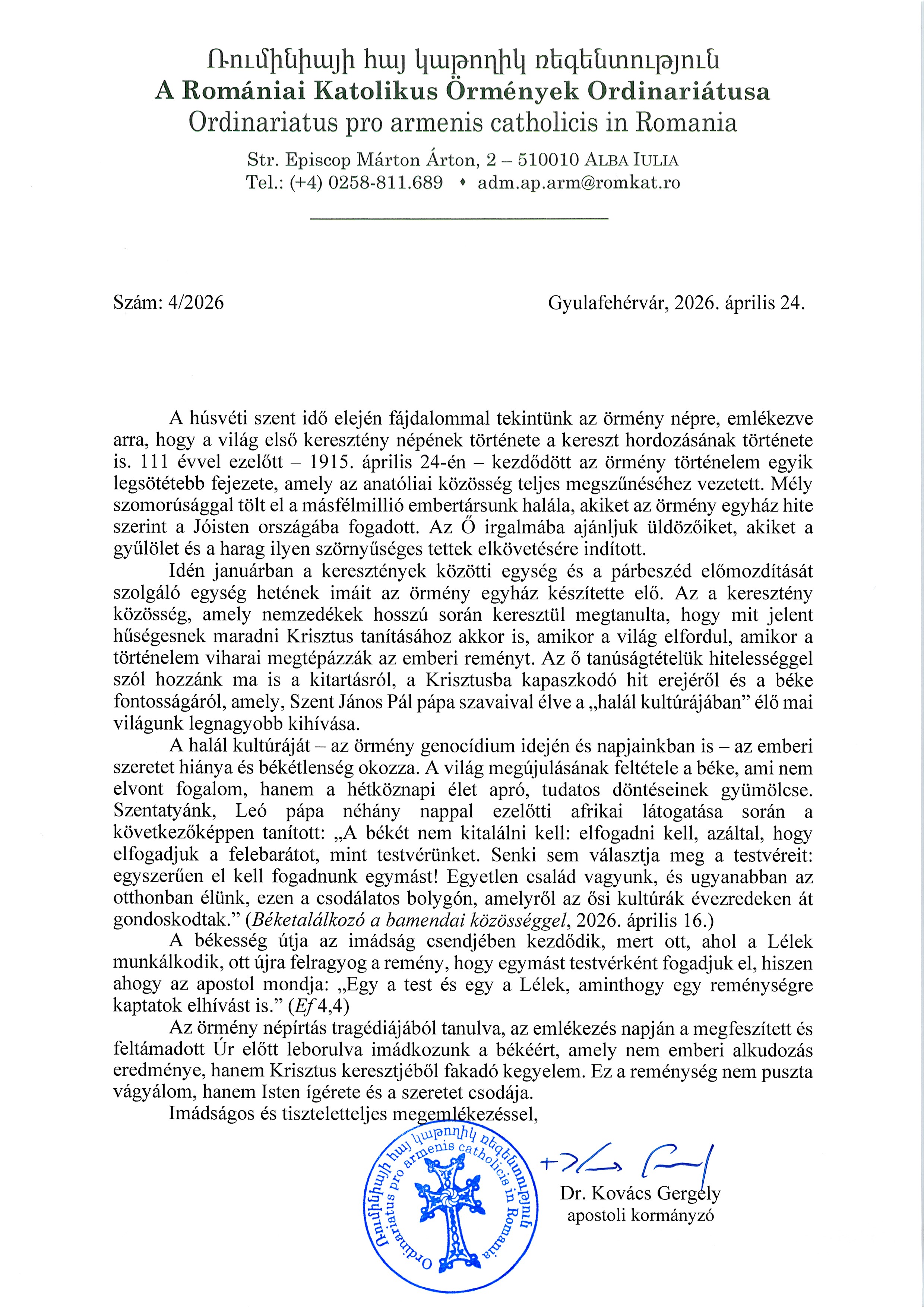 Az örmény népírtás tanulságaiból tanulva, az emlékezés napján a megfeszített és feltámadott Úr előtt leborulva imádkozunk a békéért, amely nem emberi alkudozás eredménye, hanem Krisztus keresztjéből fakadó kegyelem. Ez a reménység nem puszta vágyálom, hanem Isten ígérete és a szeretet csodája. Imádságos és tiszteletteljes megemlékezéssel