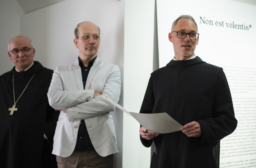 Hortobágyi T. Cirill főapát köszöntőjében két egymáshoz szorosan kapcsolódó gondolat mentén értelmezi az iskola és a kortárs művészet szerepét a Pannonhalmi Bencés Főapátság életében, és hozza közös nevezőre őket az ember formálásának feladatában.