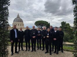 A gyulafehérvári Megtestesült Bölcsességről nevezett Papnevelő Intézet ötöd- és hatodéves növendékei főpásztorukkal, Kovács...