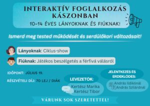 Kertész Marika és Kertész Tibor július 19-én különleges, 10–14 éves lányok és fiúk számára tartanak interaktív foglalkozást. A résztvevők játékos, élményszerű módon ismerkedhetnek meg testük működésével, valamint a serdülőkor testi-lelki változásaival.