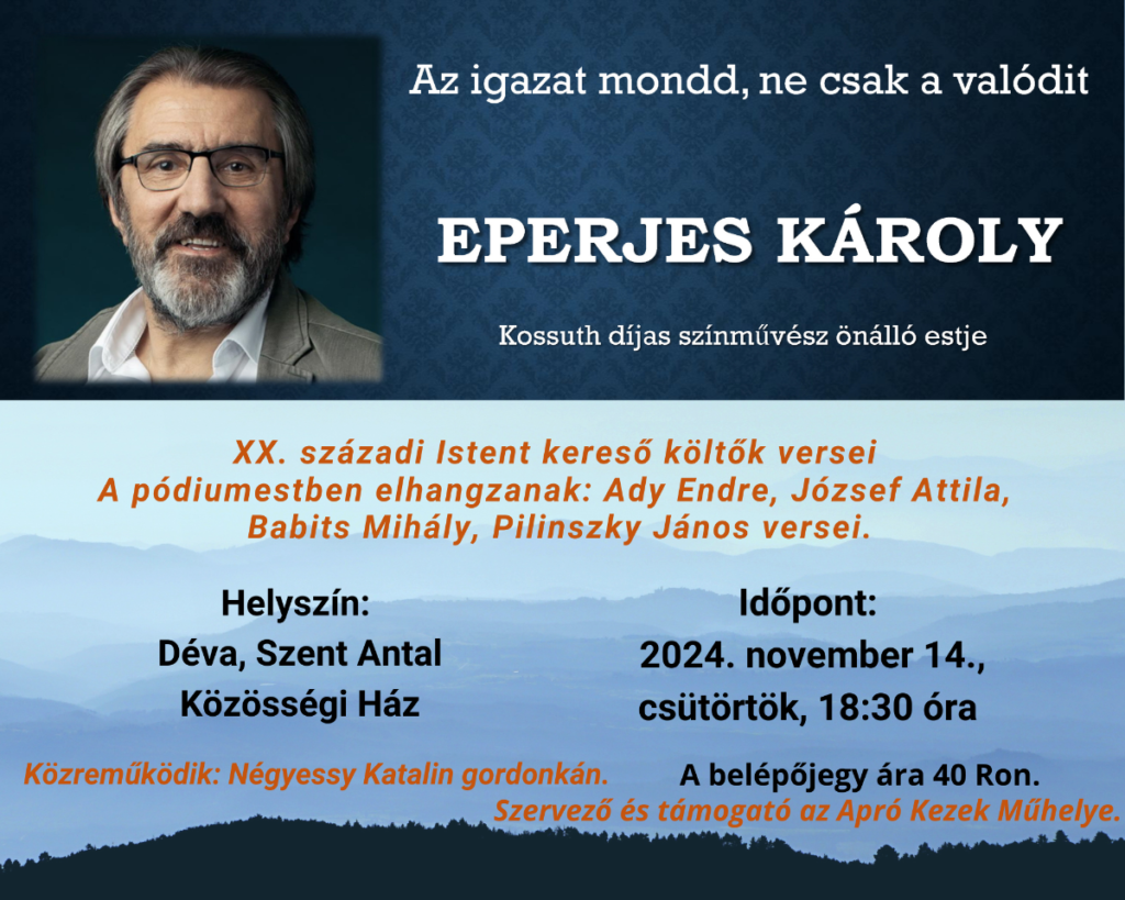 Az igazat mondd, ne csak a valódit. Eperjes Károly önálló estje. + Hozzáadás Google Naptárhoz + Exportálás iCal-ba Dátum 2024. november 14., csütörtök Idő 18:00 Helyszín Déva Kategóriák Gyulafehérvári Főegyházmegye Oszd meg ezt az eseményt!
