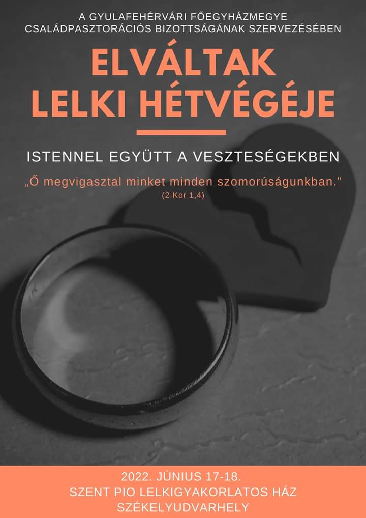 Elváltak lelki hétvégéje + Hozzáadás Google Naptárhoz + Exportálás iCal-ba Dátum 2022. június 17., péntek - 2022. június 18., szombat Helyszín Székelyudvarhely Kategóriák Gyulafehérvári Főegyházmegye Oszd meg ezt az eseményt!