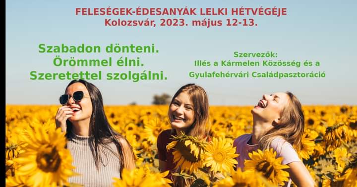 Május 12-13-án tartják a feleségek-édesanyák lelki hétvégéjét a kolozsvári Manréza Lelkigyakorlatos Házban, amelyet az Illés a Kármelen Közösség szervez a Gyulafehérvári Családpasztorációval közösen. A hétvége mottója: „Szabadon dönteni. Örömmel élni. Szeretettel szolgálni.” A program pénteken 18 órakor kezdődik és szombaton este ér véget.