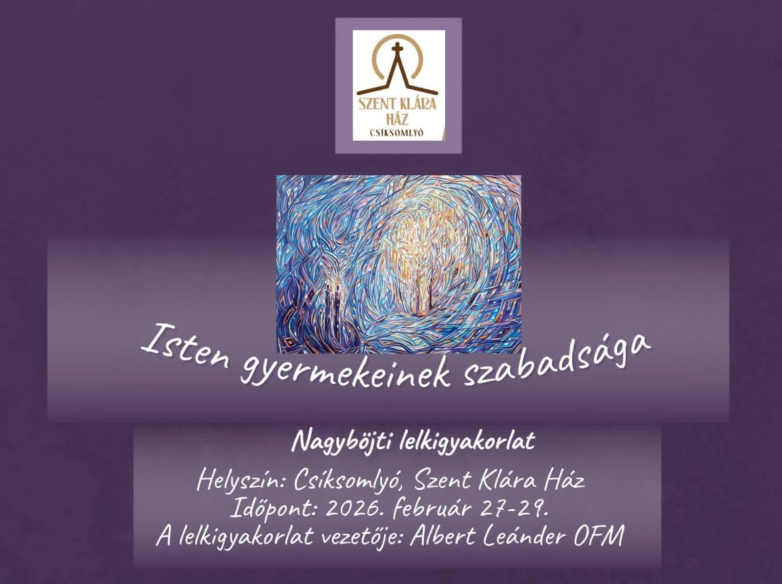 Isten gyermekeinek szabadsága. Nagyböjti lelkigyakorlat + Hozzáadás Google Naptárhoz + Exportálás iCal-ba Dátum 2026. február 27., péntek - 2026. március 01., vasárnap Idő 08:00 - 18:00 Helyszín Csíksomlyó Kategóriák Gyulafehérvári Főegyházmegye Oszd meg ezt az eseményt!