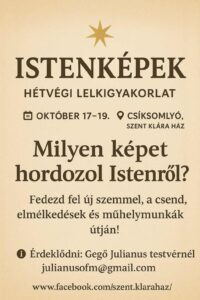 Istenképek – hétvégi lelkigyakorlat + Hozzáadás Google Naptárhoz + Exportálás iCal-ba Cimkék: Csíksomlyó Dátum 2025. október 17., péntek - 2025. október 19., vasárnap Idő All of the day Helyszín Csíksomlyó Kategóriák Gyulafehérvári Főegyházmegye Oszd meg ezt az eseményt!