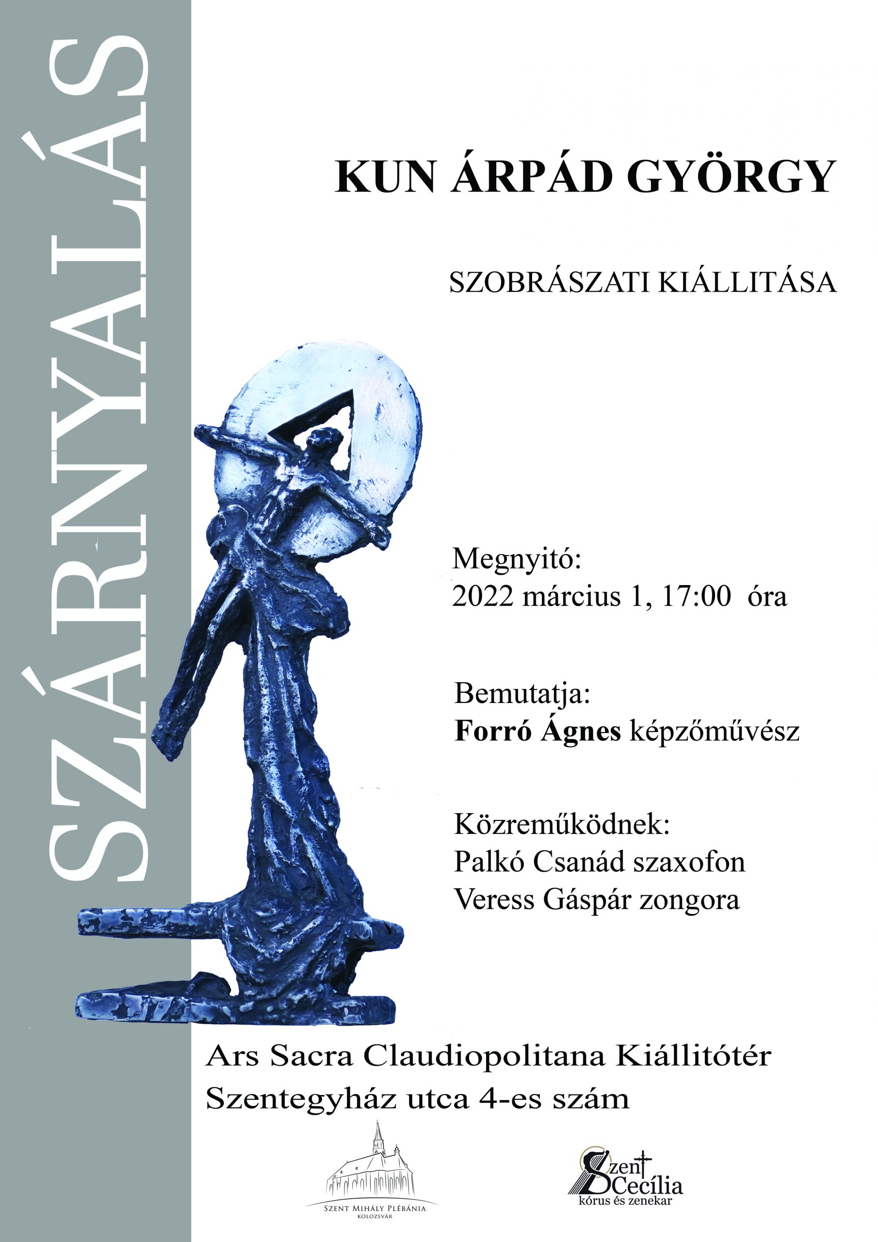 Az Ars Sacra Claudiopolitana Egyházi Kiállítótér márciusi tárlatának meghívottja Kun Árpád György szobrász. A Szárnyalás névre hallgató tárlatot (szobrok, grafikák) Forró Ágnes képzőművész fogja bemutatni. Fellép Palkó Csanád (szaxofon) és Veress Gáspár (zongora). A kiállításmegnyitóra március 1-én kerül sor a katolikus galériában 17 órától.