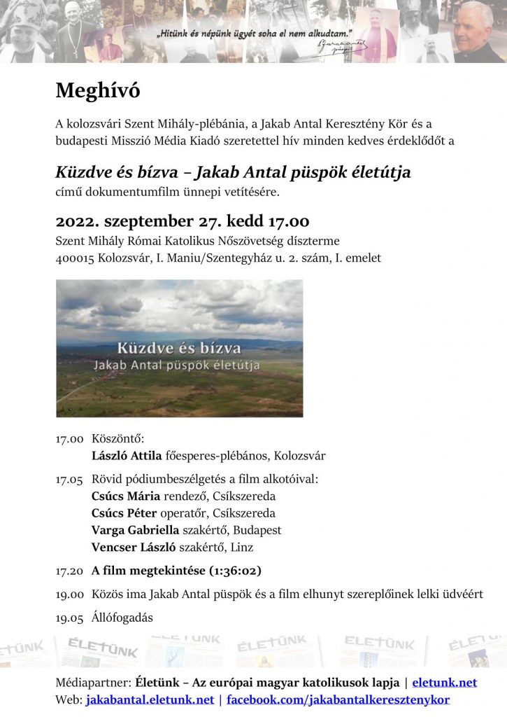 Küzdve és bízva – Jakab Antal életútja (filmvetítés) + Hozzáadás Google Naptárhoz + Exportálás iCal-ba Dátum 2022. szeptember 27., kedd Idő 17:00 Kategóriák Gyulafehérvári Főegyházmegye Oszd meg ezt az eseményt!