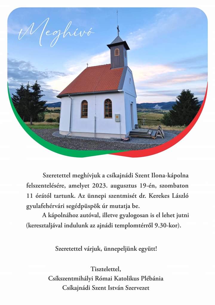 Szent Ilona-kápolna felszentelése + Hozzáadás Google Naptárhoz + Exportálás iCal-ba Dátum 2023. augusztus 19., szombat Helyszín Ajnád Kategóriák Gyulafehérvári Főegyházmegye Oszd meg ezt az eseményt!