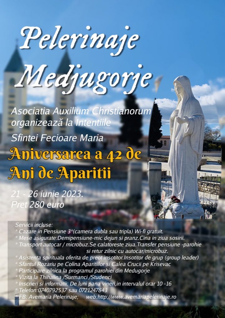 Zarándoklat Međugorjébe (román nyelvű csoport) + Hozzáadás Google Naptárhoz + Exportálás iCal-ba Dátum 2023. június 21., szerda - 2023. június 26., hétfő Kategóriák Temesvári Egyházmegye Oszd meg ezt az eseményt!
